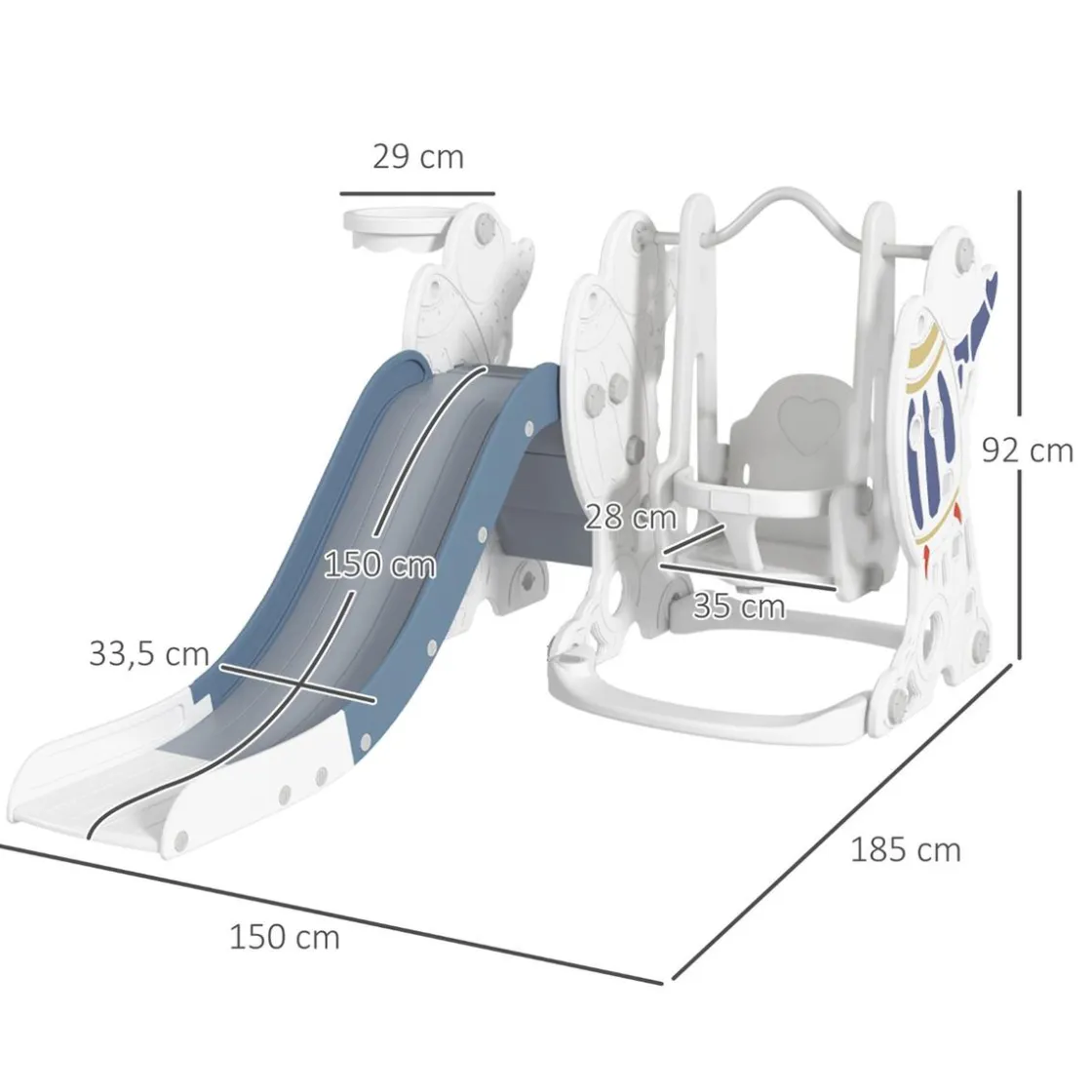 - 3 en 1, compuesto por tobogán, columpio y canasta de baloncesto