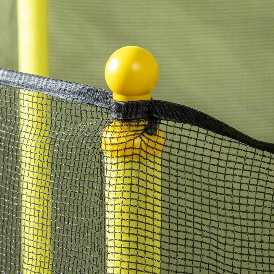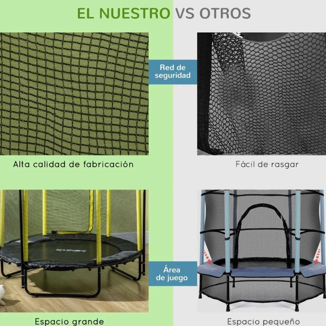 - Cama elástica con red de seguridad, postes acolchados y almohadillas para mantener a los niños seguros.