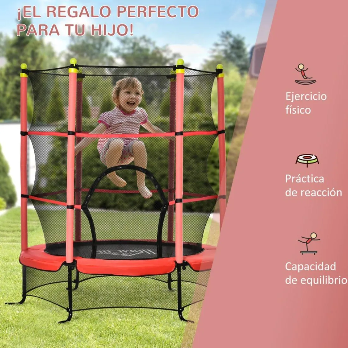 - Incluye una red alrededor de las patas para evitar que ni los niños ni las mascotas se metan debajo del trampolín.