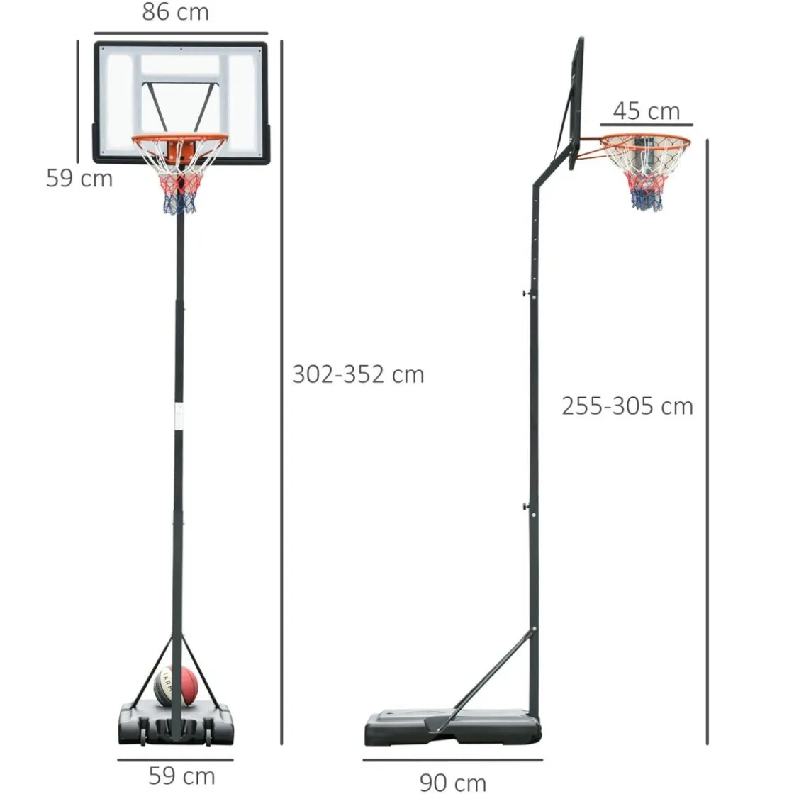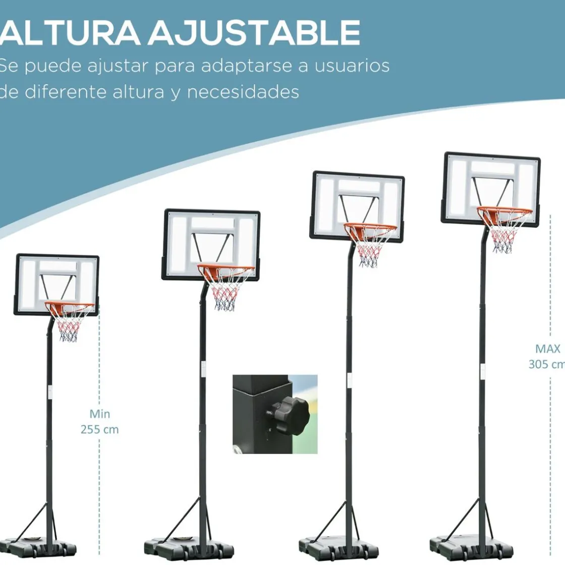 - Altura ajustable. Este soporte de canasta de baloncesto se puede ajustar de 302 cm a 352 cm (altura total del tablero, la de la canasta es unos 45 cm aproximadamente inferior) para adaptarse a usuarios de diferentes alturas y necesidades. Ideal tanto para adolescentes como para adultos.