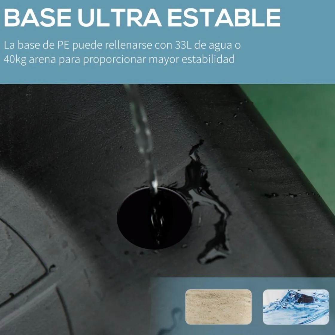 - Incluye una gran base rellenable con agua o arena para mayor estabilidad y robustez.