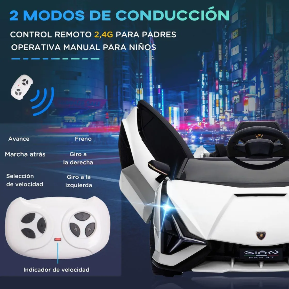 Lo pueden conducir los niños con el volante de dirección del coche o un adulto con el control remoto incluido. Los niños se lo pasarán en grande con este coche infantil con licencia oficial de Lamborghini.