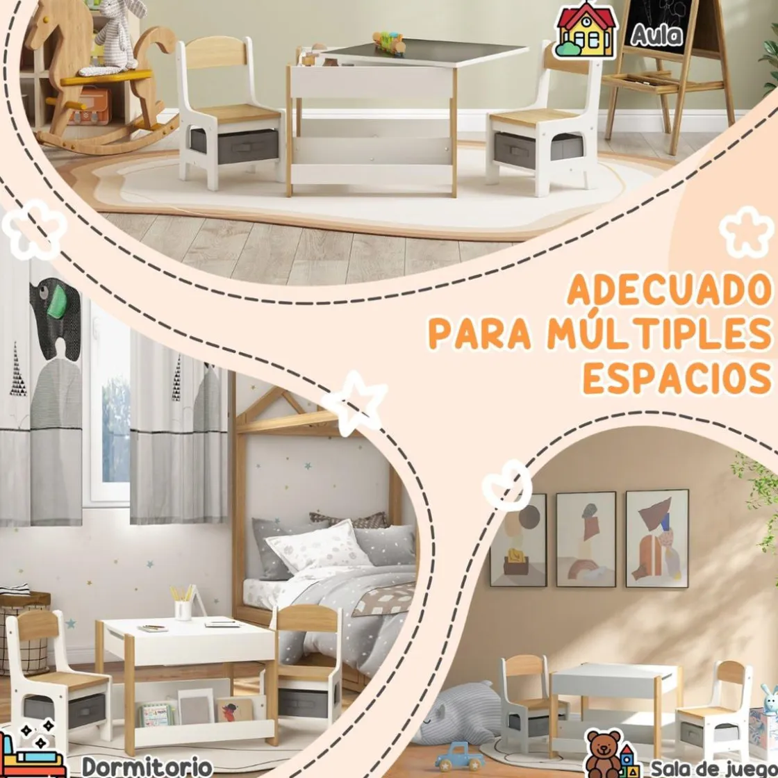 - Conjunto completo: Mesa con encimera reversible y 2 sillas con cajones para almacenamiento.