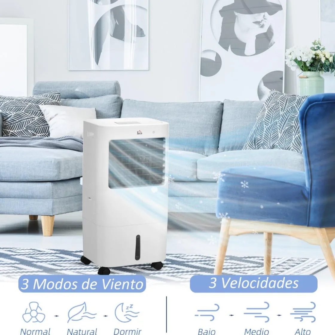 - Tiene 3 modos de funcionamiento, ventilador, refrigeración con hielo y humidificador.
