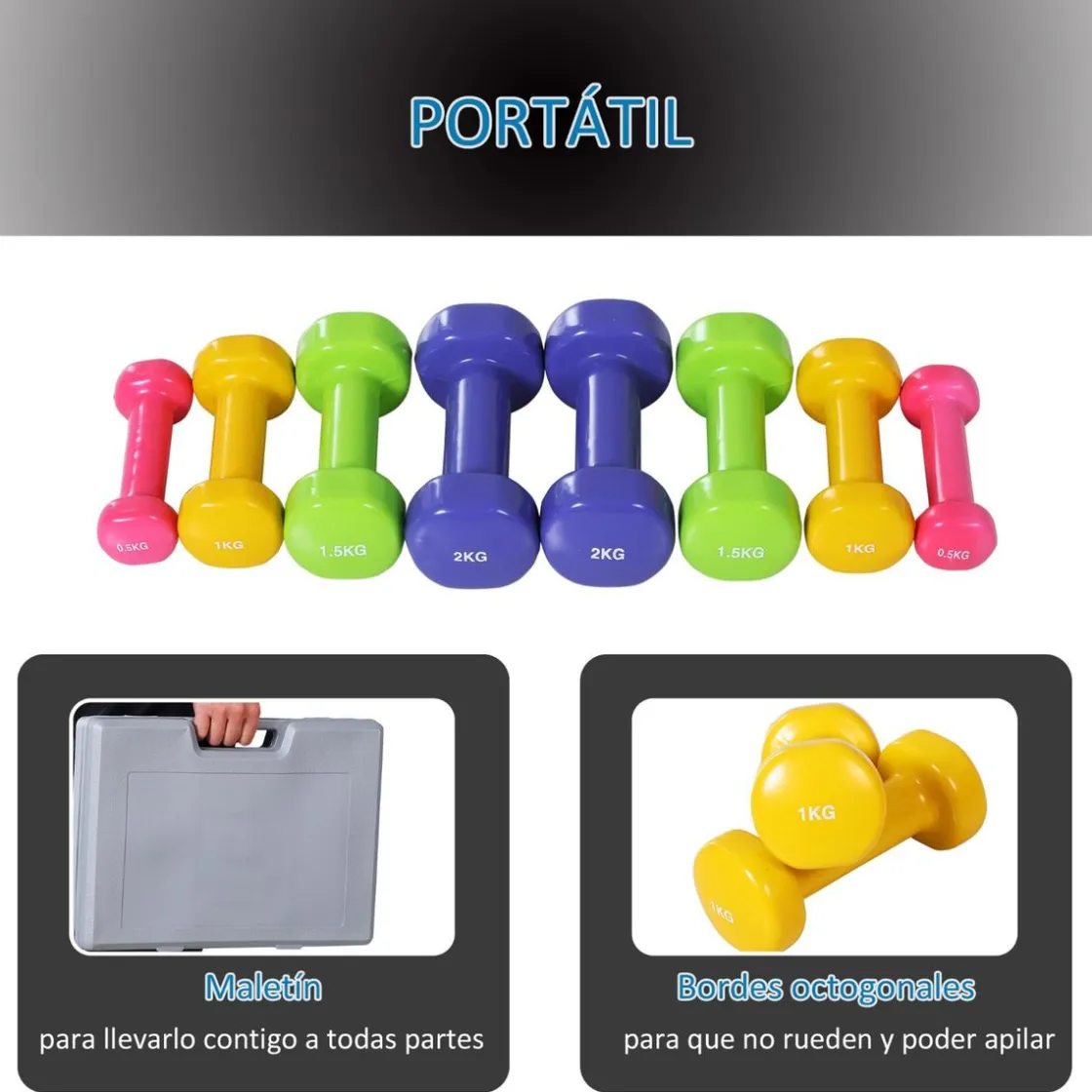 ¿A qué esperas para empezar a hacer tus ejercicios con mancuernas? Si no te gusta ir al gimnasio todos los días, puedes mantenerte en forma y con buena salud haciendo deporte en casa. Con este set de 8 mancuernas de 4 pesos diferentes podrás realizar ejercicios de diferentes intensidades. De diferentes colores y con pesos marcados será fácil identificar las mancuernas. Debido a que son hexagonales, son apilables y no rodarán por el suelo si se caen.