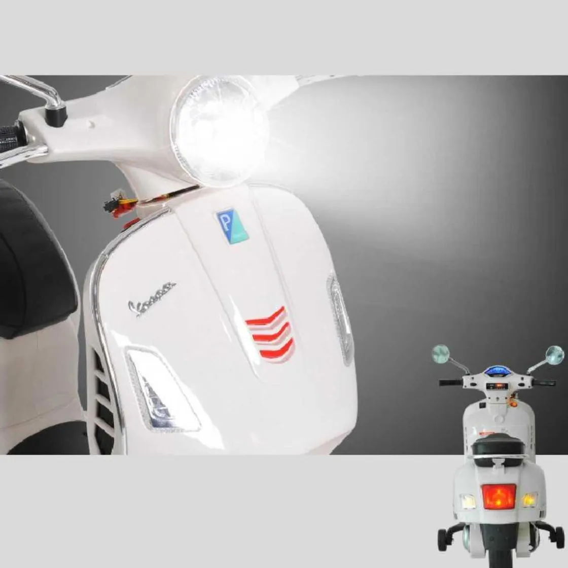 Tiene muchas características para aproximarse a una moto real: faros LED, luces traseras LED, música, interfaz USB y MP3, etc.
