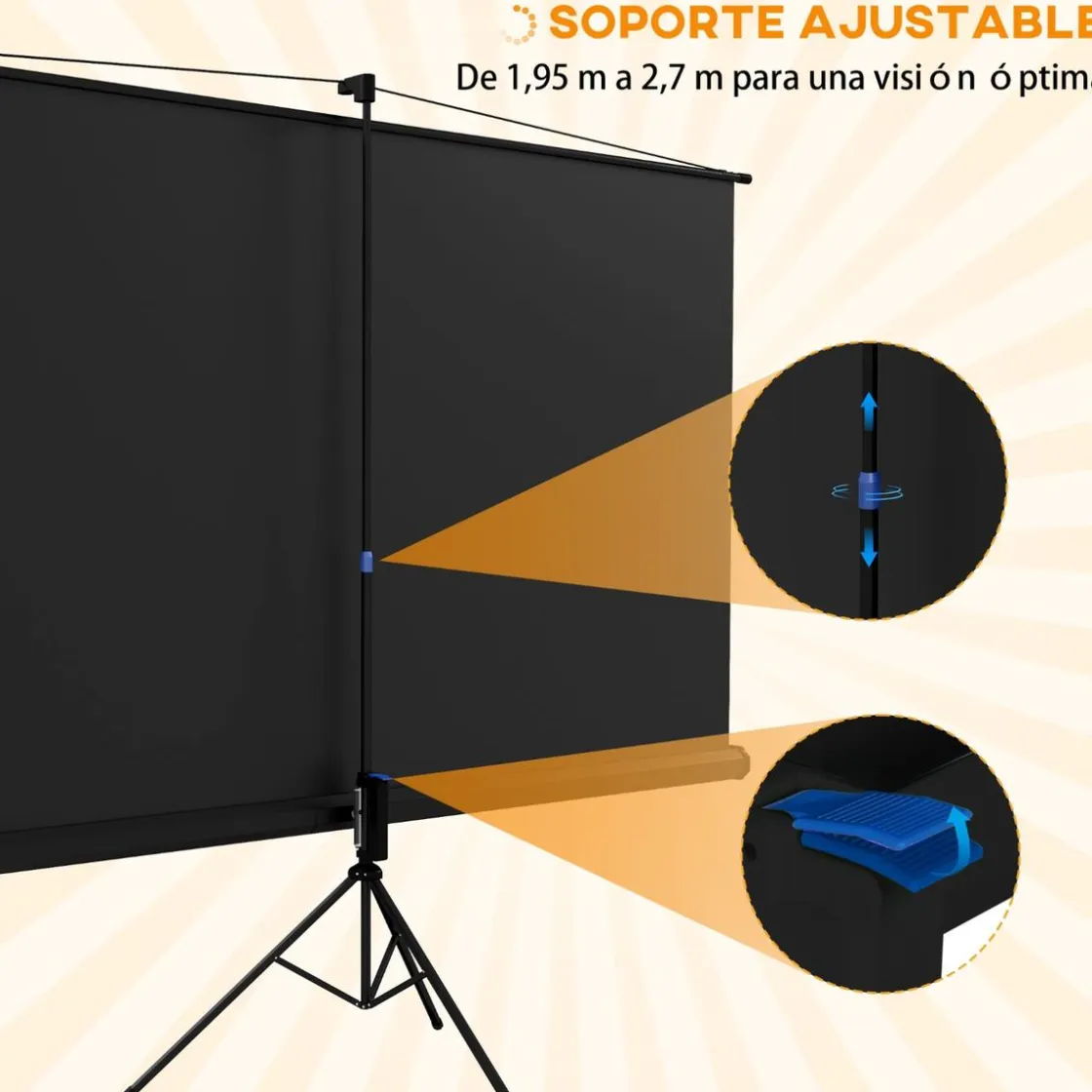 - Pantalla de proyección de 100 pulgadas con soporte, proporción 16:9 y ángulo de visión amplio de 160 grados.
