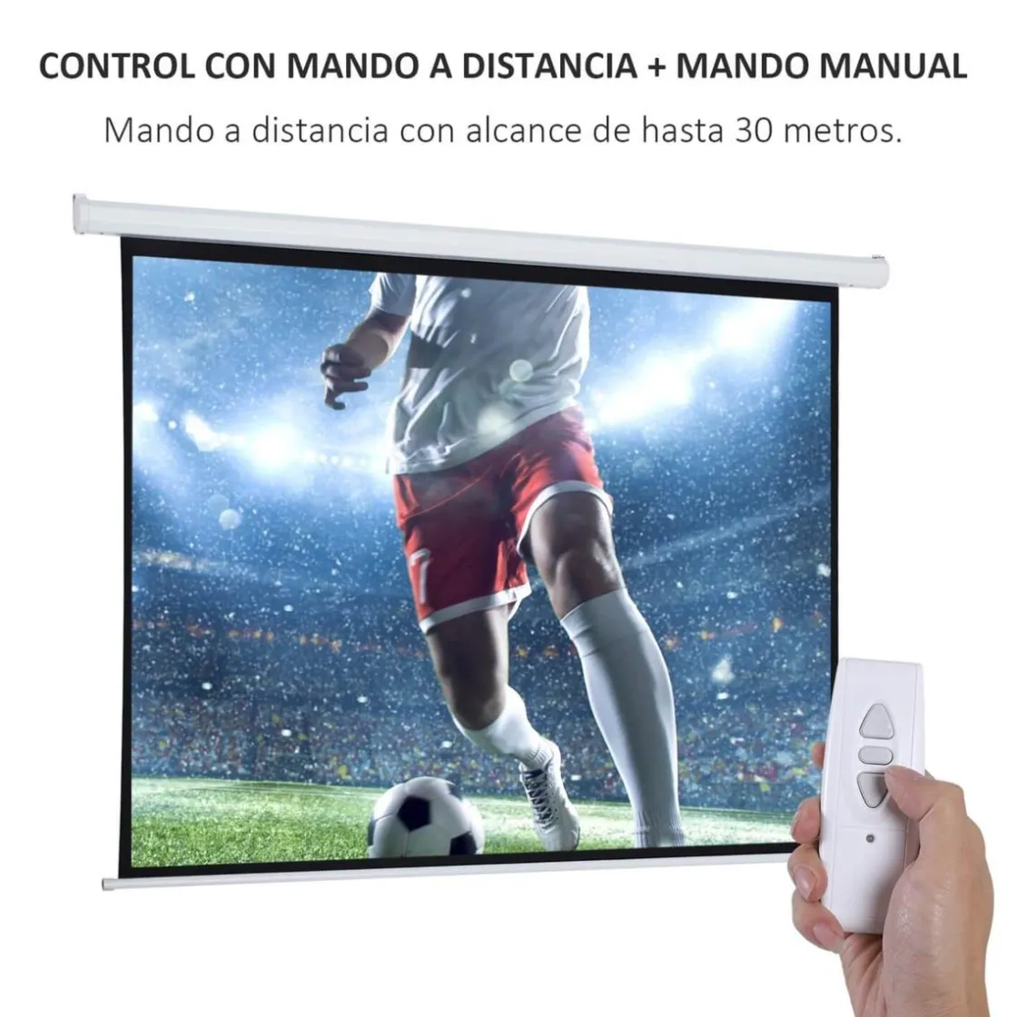 - La tela sube y baja con un control remoto de hasta 30 m de alcance.