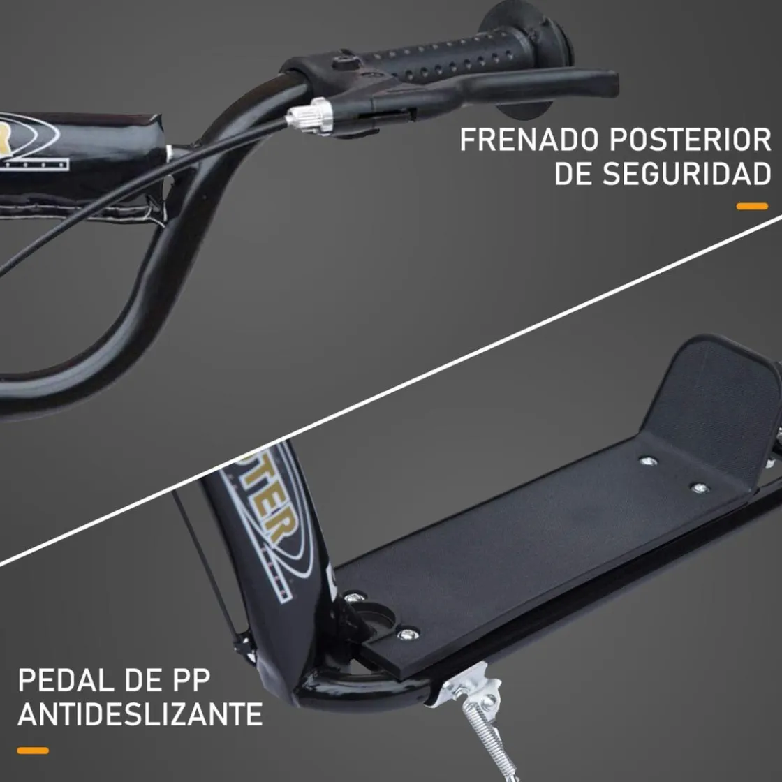 Hecho de acero es un patinete resistente y estable. Y cuenta con 2 ruedas grandes de EVA de 12 pulgadas, que proporcionan un desplazamiento suave y seguro. Tiene una base compuesta por una placa grande con superficie antideslizante, para mayor agarre de los pies y garantizar un deslizamiento seguro con el patinete.