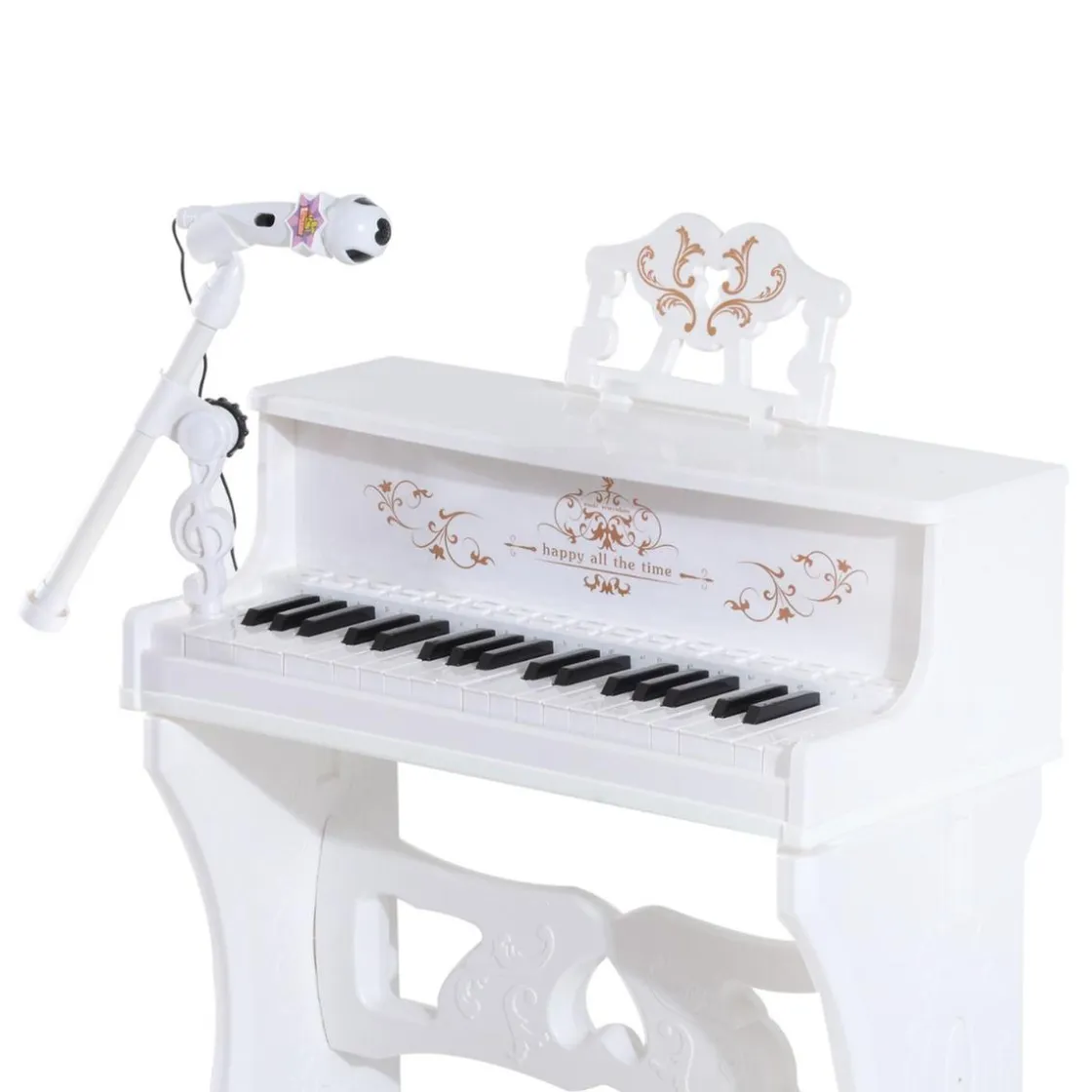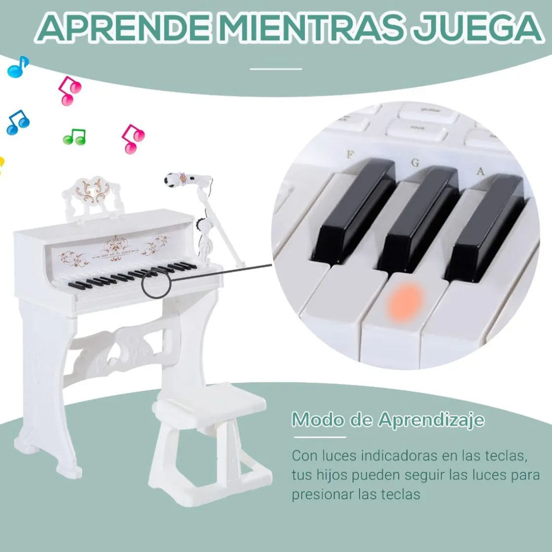 Homcom – Piano Electrónico 37 teclas con taburete Blanco. ¿Has visto qué piano infantil tan bonito? Imitando los clásicos pianos de toda la vida, este piano de Homcom de 37 teclas, viene con una banqueta a juego y un micrófono. Con canciones preinstaladas y múltiples funciones, entre ellas la de aprendizaje de canciones mediante la iluminación de las teclas ¡les encantará!