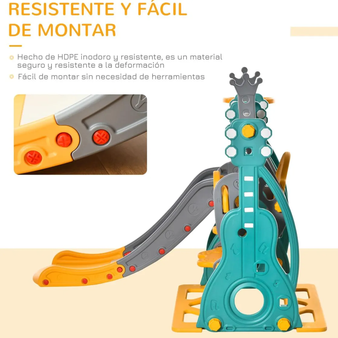 - 3 en 1, compuesto por tobogán, columpio con asiento ancho y canasta de baloncesto.