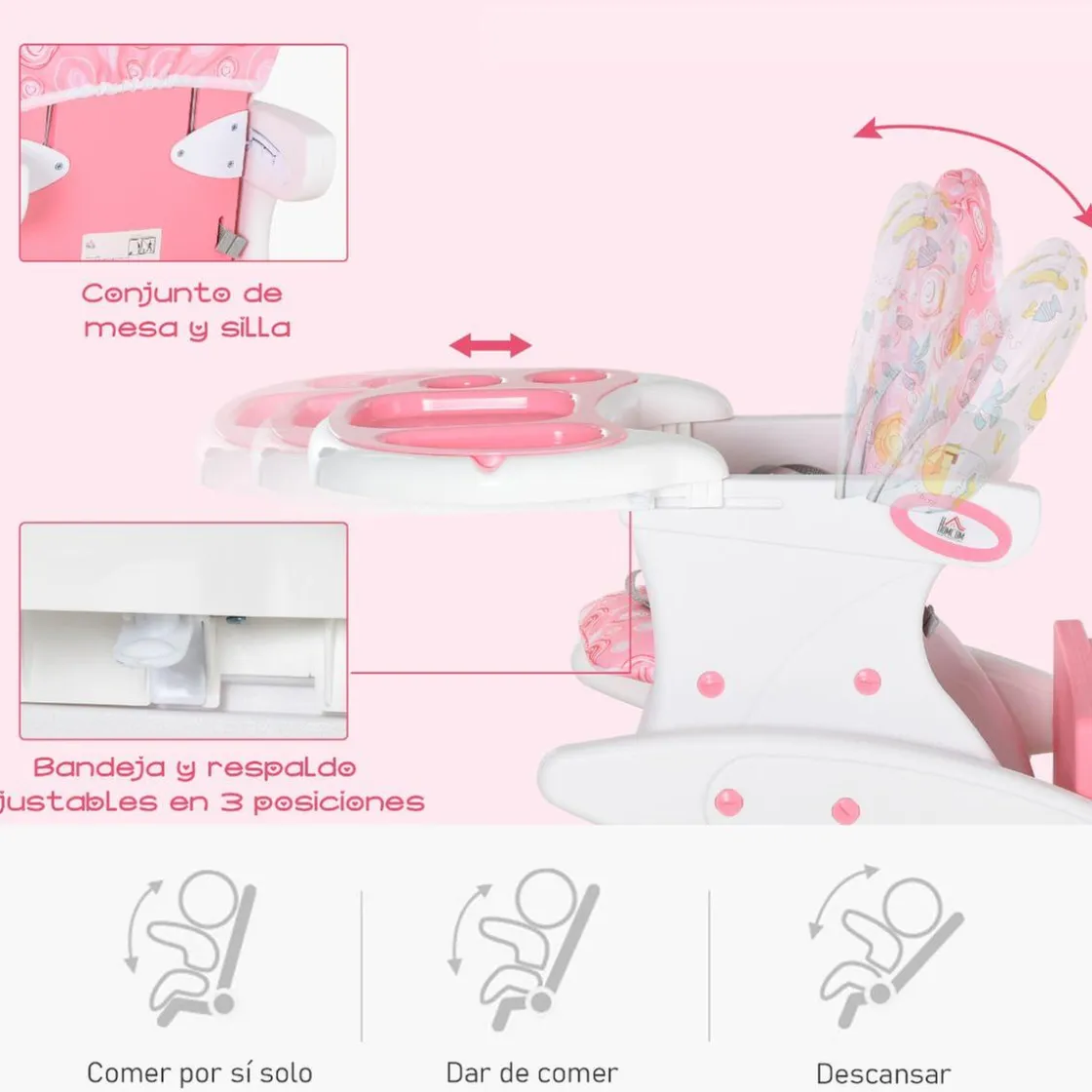 Homcom – Trona 3 en 1 rosa, una trona con bandeja ideal para alimentar al bebé de forma cómoda y cuando crezca se convierte en una silla y una mesa para que dibuje y juegue.