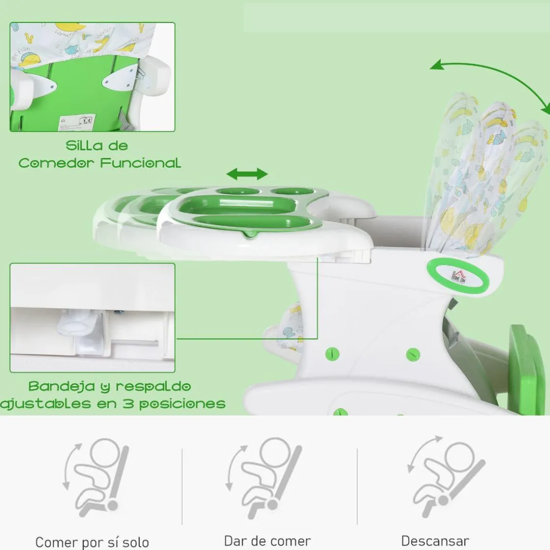 Homcom – Trona 3 en 1 verde, una trona con bandeja ideal para alimentar al bebé de forma cómoda y cuando crezca se convierte en una silla y una mesa para que dibuje y juegue.