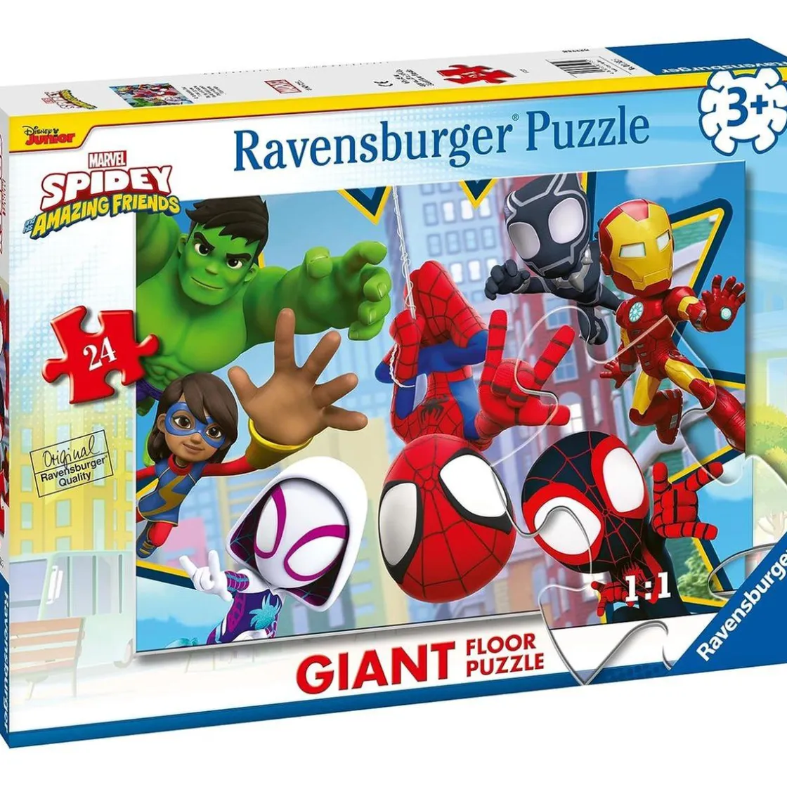 Conoce el Ravensburger – Puzzle Spidey, Colección 24 Giant Suelo, con 24 gigantescas y coloridas piezas que forman una escena increíble de tu superhéroe favorito, Spidey. Imagina, crea y diviértete mientras ensamblas cada pieza, estimulando tu curiosidad, imaginación y habilidades de resolución de problemas. Es un pasatiempo educativo y emocionante que te hará sentir orgulloso de tu creación.