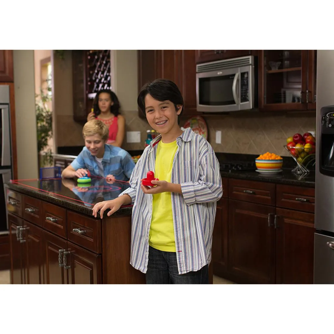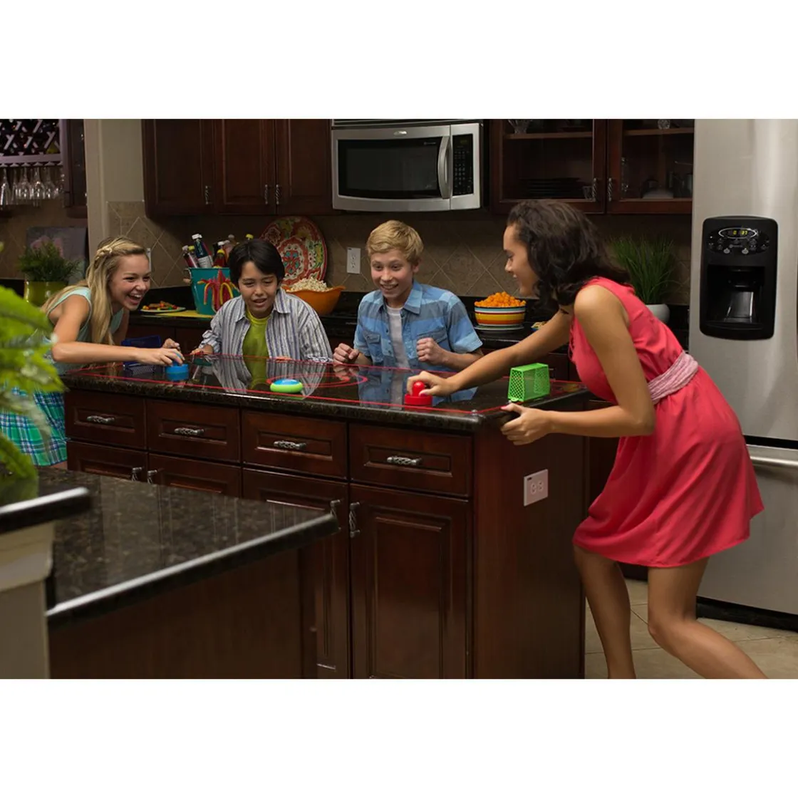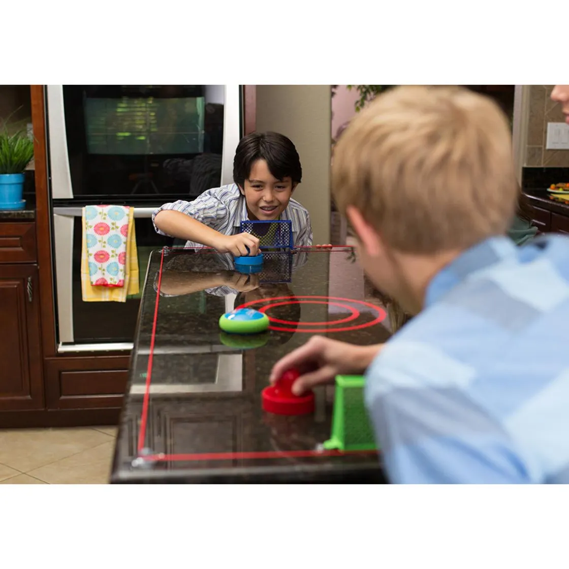 Hover Hockey – Mesa de Hockey Portátil, un playset que incluye 1 disco Hover Hockey, 2 mazos, 6.7 metros de cordón delimitador, 6 ventosas grandes para delimitar el área de juego, 4 ventosas pequeñas para colocar las porterías y 2 porterías. Hover Hockey es completamente portátil. ¡Puedes utilizarlo para jugar en casa, en un viaje, o incluso en tu fiesta de cumpleaños! ¡No gastes más tiempo y dinero en el salón recreativo! Asegura la cuerda que delimita el campo con las 6 ventosas de sujeción, coloca las porterías y ¡Listo! Ahora puedes convertir cualquier mesa en una mesa de hockey de aire, o incluso jugar en el suelo! El disco funciona con 2 pilas AAA (NO incluidas). Edad recomendada +6 años.