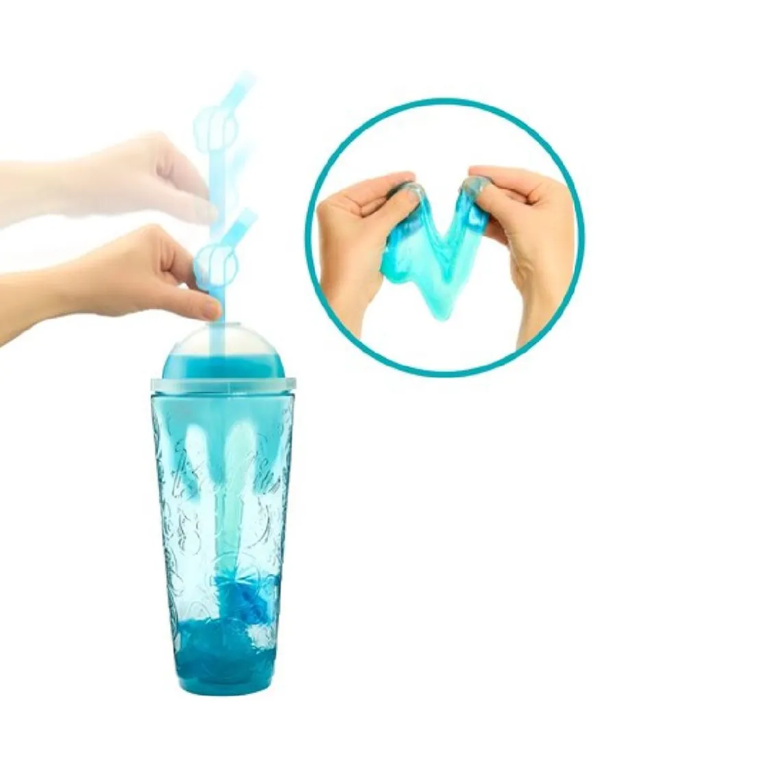 Después, vuelve a enroscar la tapa y usa la pajita para romper la parte superior y liberar el Slime azul. ¡Mira cómo cubre los cubitos de hielo!
