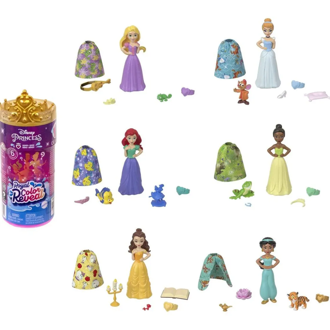 Bienvenido a la excitante aventura de revelar y descubrir las maravillosas princesas de Disney con agua. Cada muñeca te espera cubierta con un misterioso color que al poner en agua revelará a tu princesa. Entre las posibilidades están algunas de las más queridas princesas como Ariel, Cenicienta, Tiana, Bella, Jasmine y Rapunzel. No solo descubrirás a tu muñeca sino también varios accesorios mágicos que completarán la diversión.