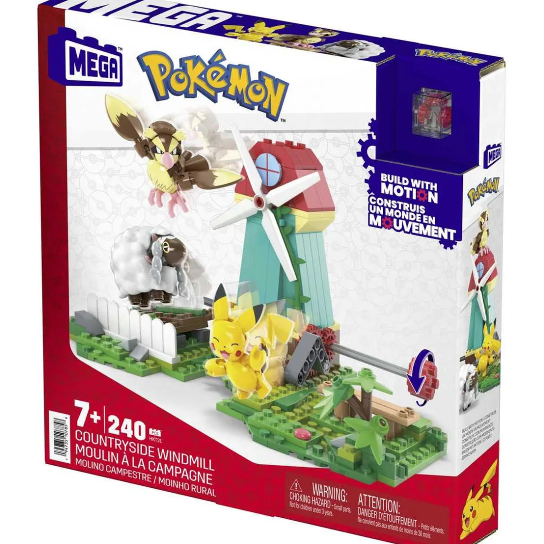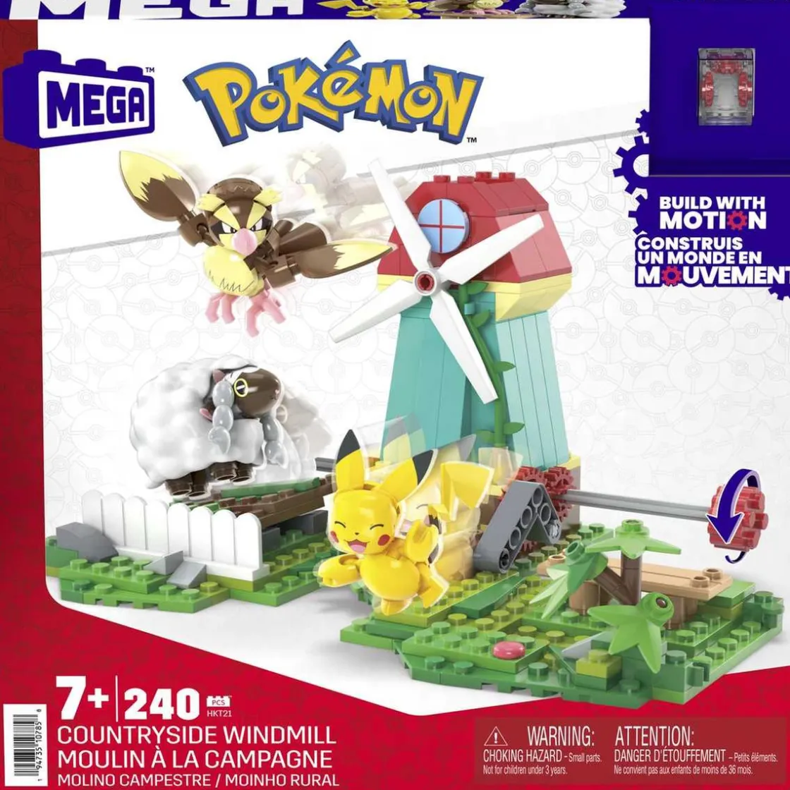 Este juego de construcción cuenta con un bloque de movimiento innovador que permite que Wooloo corra por el campo y Pikachu salude a los visitantes, mientras Pidgey vuela sobre el molino de viento. Además, puedes conectar el Molino de Campo con otros conjuntos de la colección Constructor de aventuras para crear un mundo Pokémon lleno de movimiento y diversión.