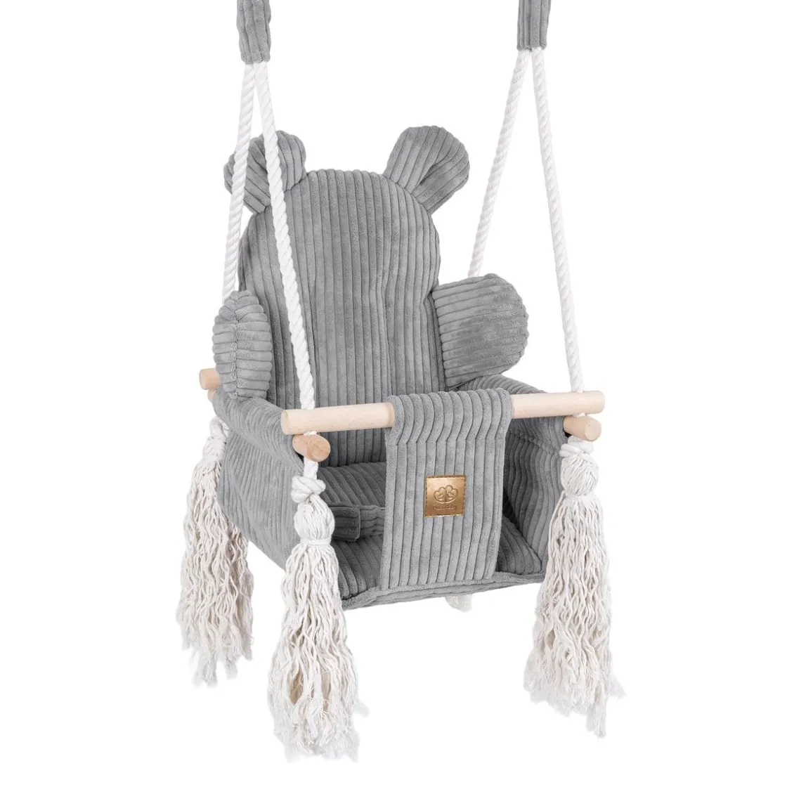 Descubre el acogedor columpio interior para bebé modelo “Bear Swing”, disponible en colores suaves como rosa polvo, ecru, gris o verde oliva. Fabricado en tejido 100 % poliéster de tacto delicado, este columpio está pensado para acompañar con estilo la habitación infantil y brindar momentos de juego y relajación seguro en casa.