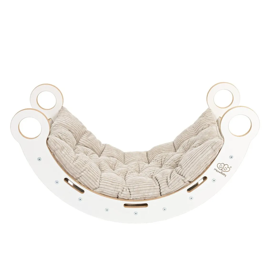 El Medium Dream Rocker White Wood with Beige Pillow es una mecedora elegante que combina el diseño Montessori con una estética moderna. Fabricada en madera de pino pintada en blanco y con un cojín beige acolchado, ofrece una experiencia de balanceo suave y segura para los niños.