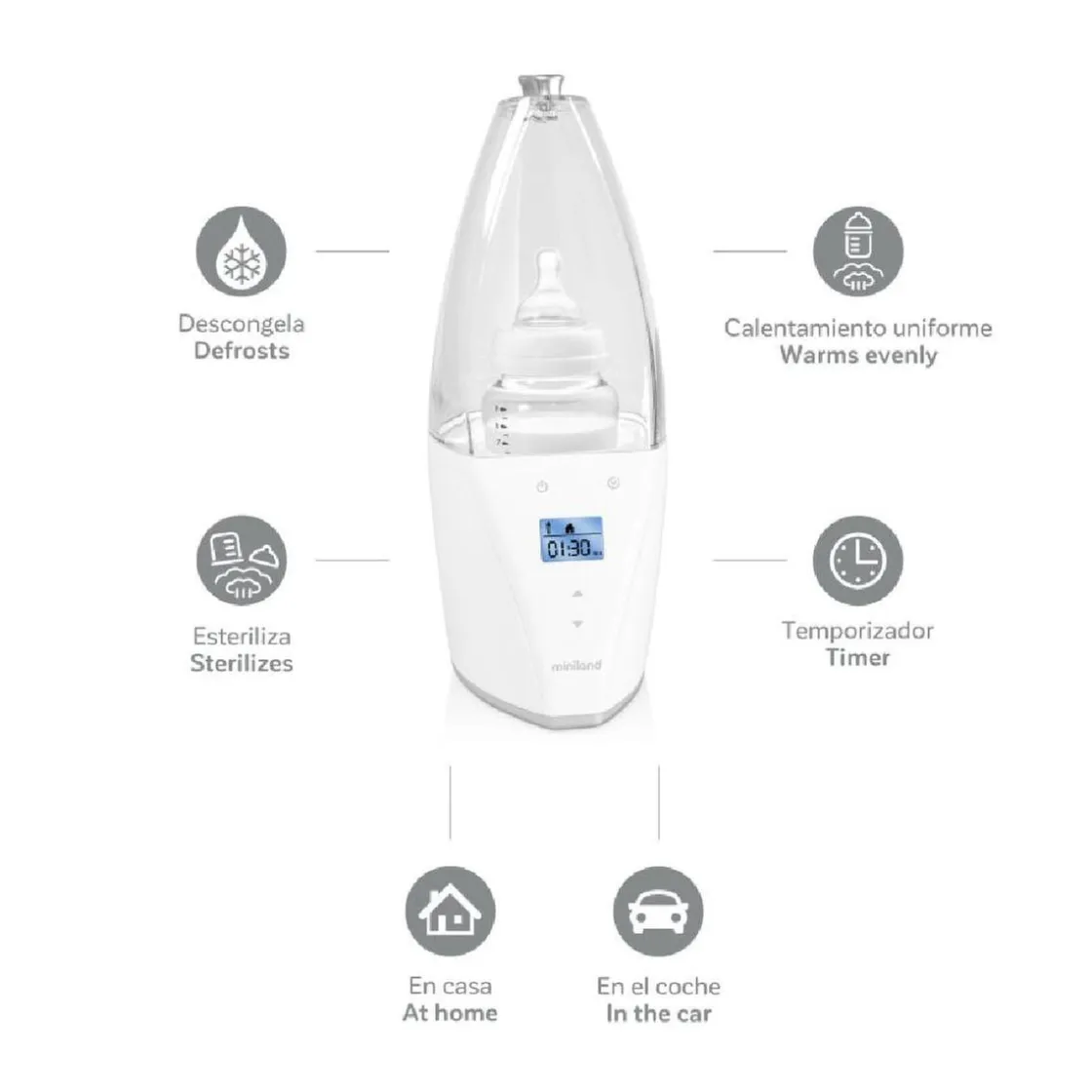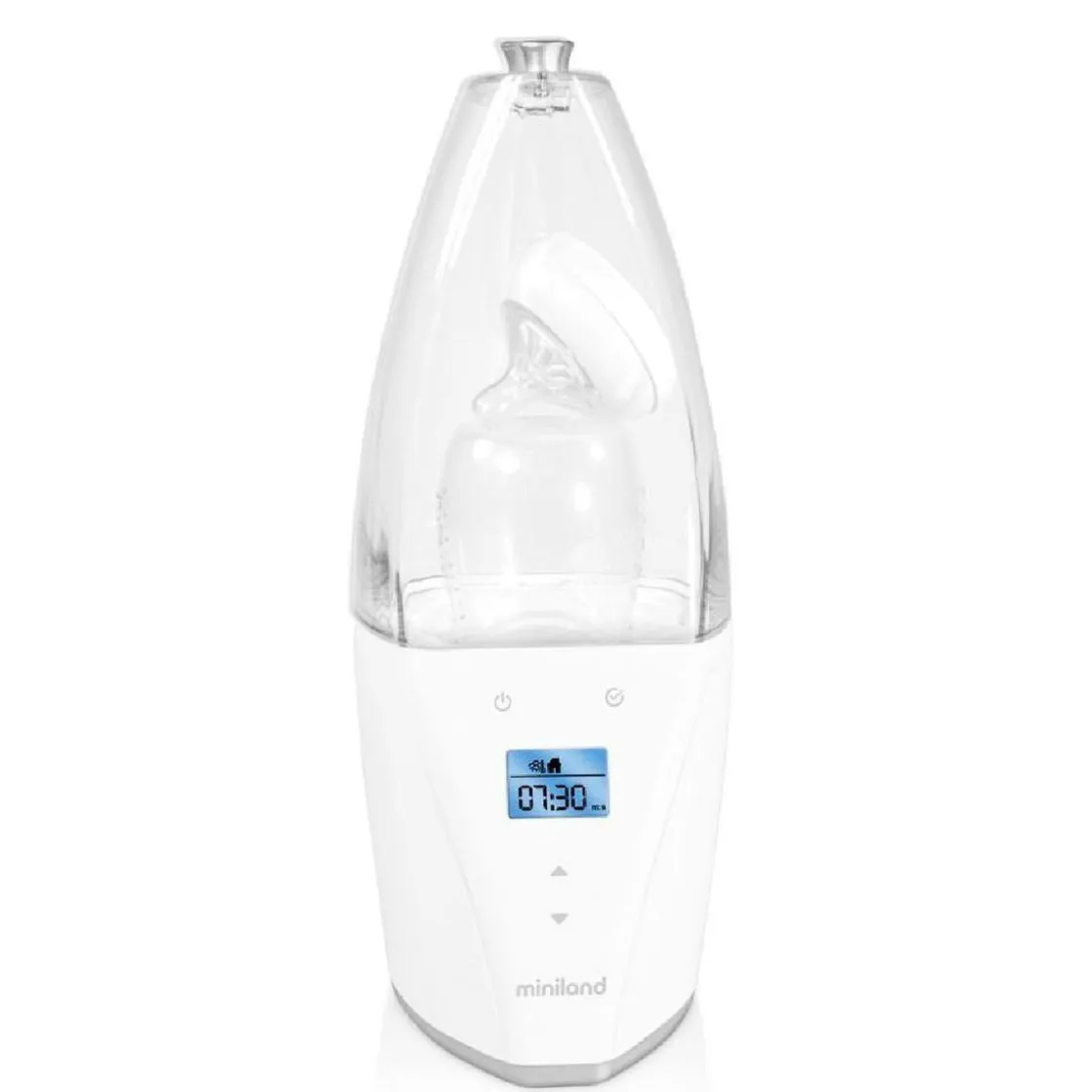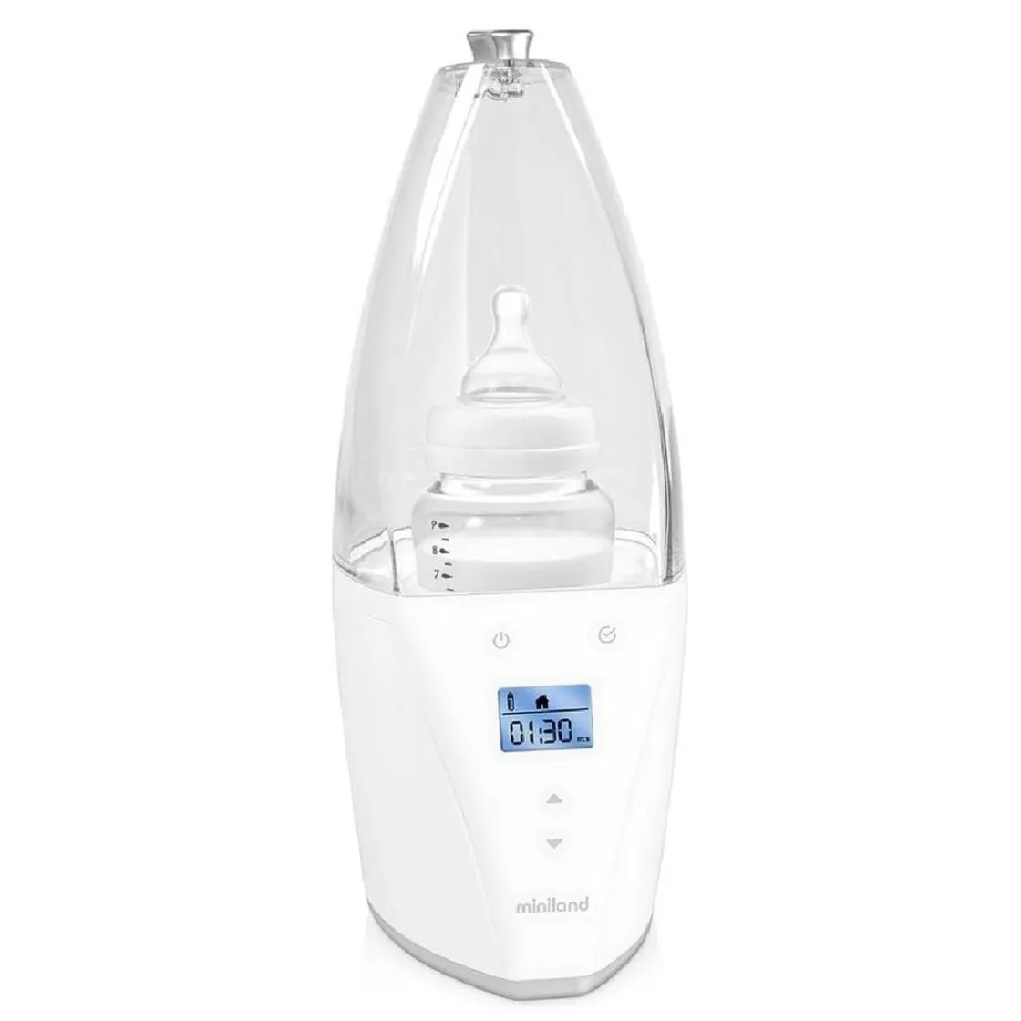 Miniland – Calientabiberones y Esterilizador Warmy, un calientabiberones y esterilizador digital con funciones avanzadas que calcula automáticamente el tiempo de funcionamiento necesario para el tipo de comida, tamaño y temperatura inicial.