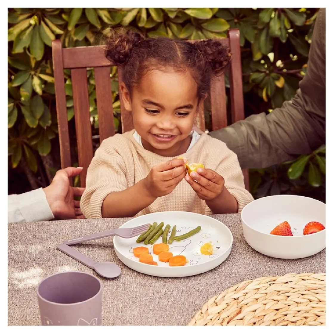 - Formación en autonomía alimentaria: Gracias a sus dimensiones reducidas, el tenedor y la cuchara están diseñados para que el bebé aprenda a comer de forma independiente, mientras que el vaso facilita el aprendizaje de la posición correcta para beber sin derrames.