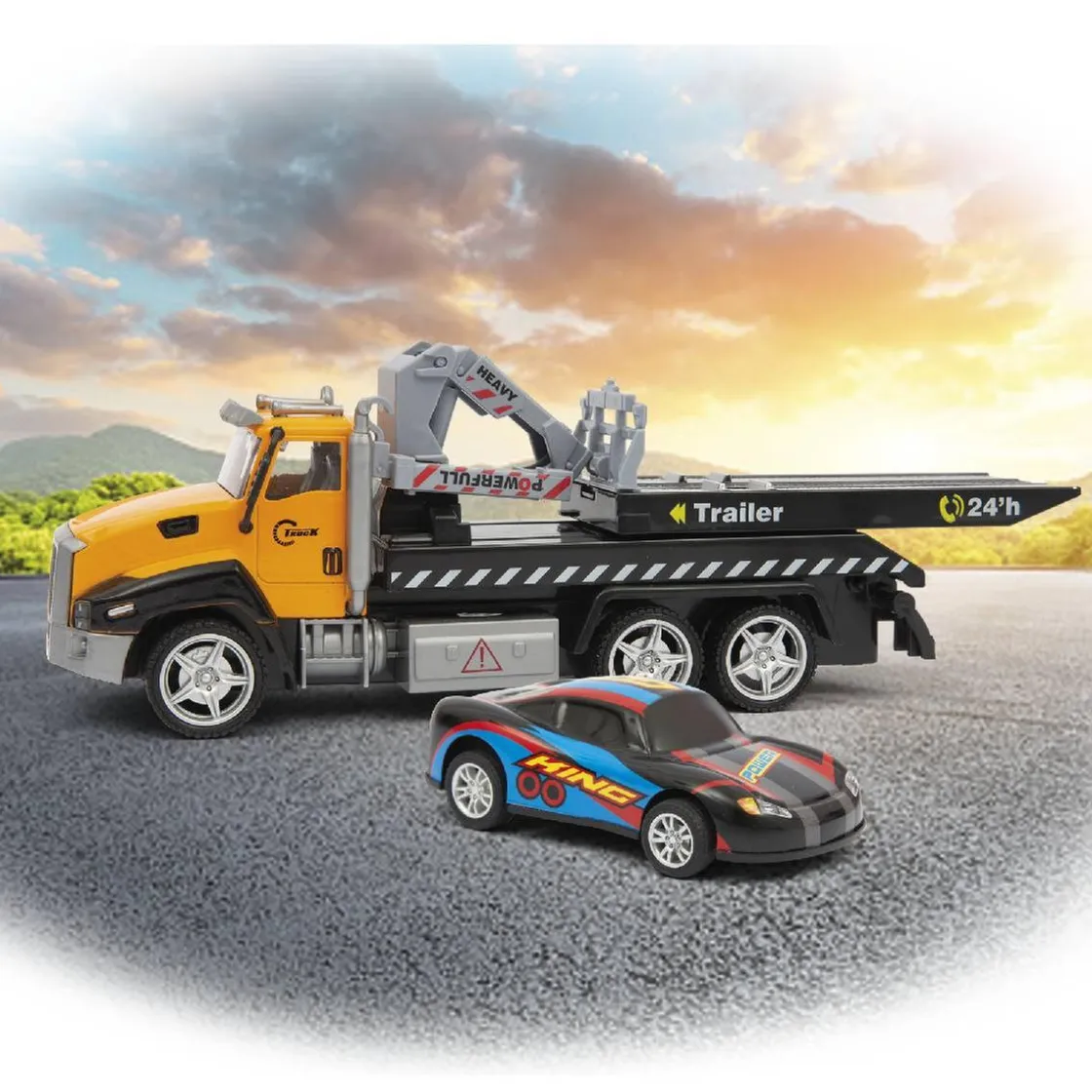 Motor & Co – Camión retrofricción con vehículo, un camión grua y un coche metálicos que corren por fricción.
