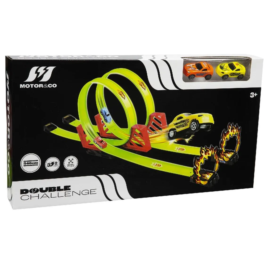 Doble pista acrobática de 548 cm, con dos coches de carga trasera incluidos para jugar con amigos y hacer carreras alucinantes.