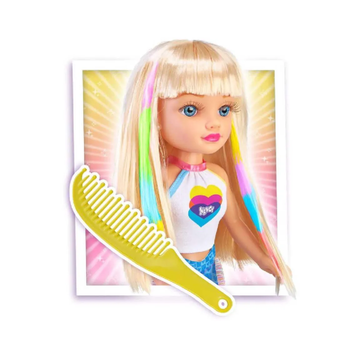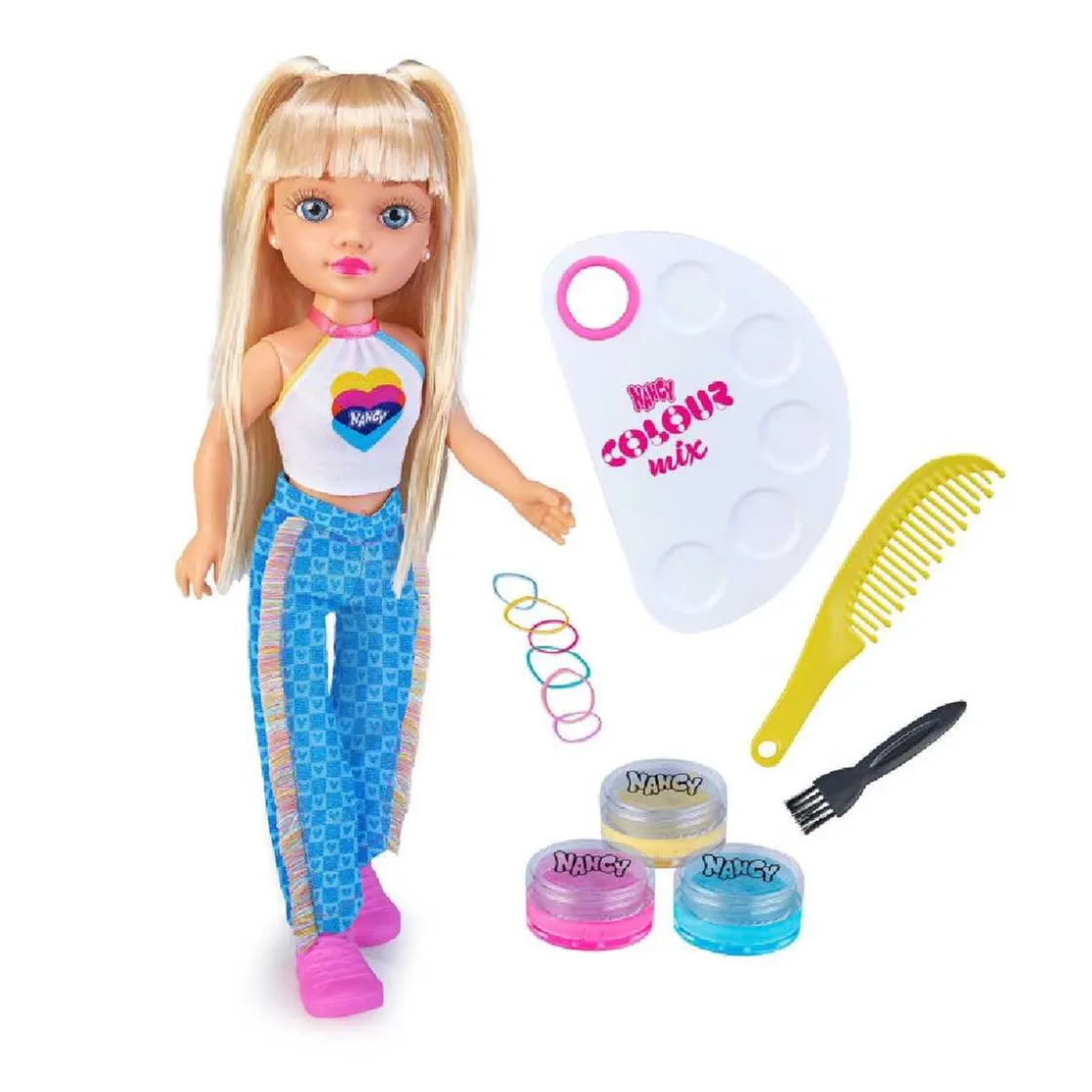 ¡Libera tu imaginación y creatividad con Nancy – Colour Mix! Esta muñeca viene con un kit de acuarelas que te permite crear una amplia gama de colores. Con la práctica paleta, podrás mezclar los colores para dar vida a nuevas tonalidades. Luego, usa el pincel incluido para añadir mechas de colores y transformar el cabello de Nancy con un estilo único y personalizado. No solo eso, con los coleteros y el peine que también vienen en el set, puedes experimentar con diferentes peinados llenos de creatividad. ¡La diversión no tiene límites!