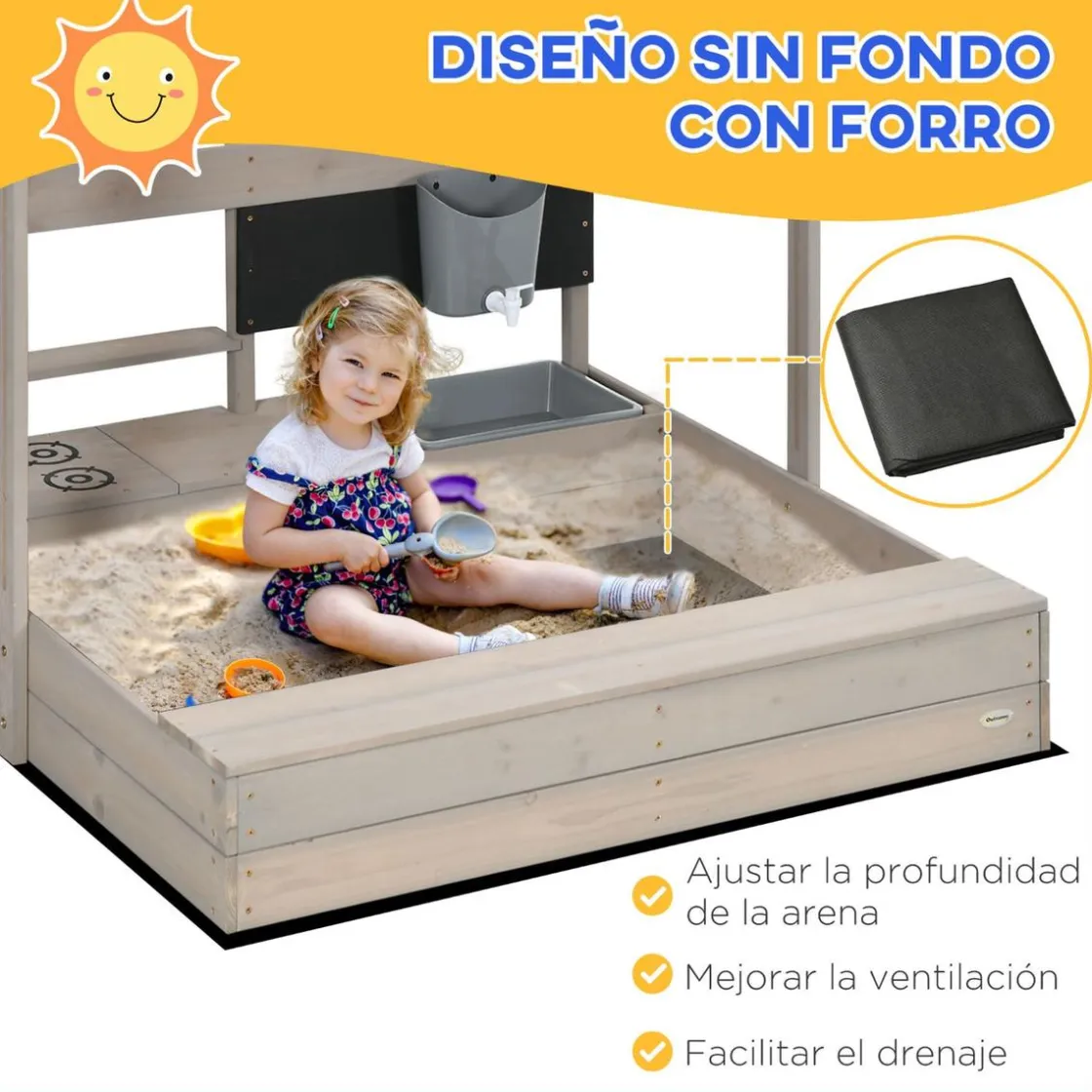 El arenero está hecho de madera de abeto y también tiene un toldo ajustable, para proteger a los niños del sol mientras se divierten.