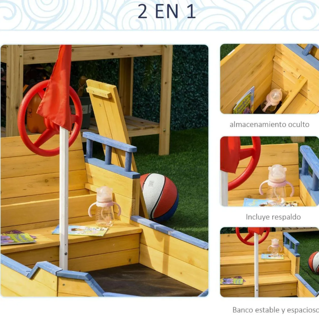 - La caja de arena con forma de barco tiene un asiento amplio y estable para los niños.
