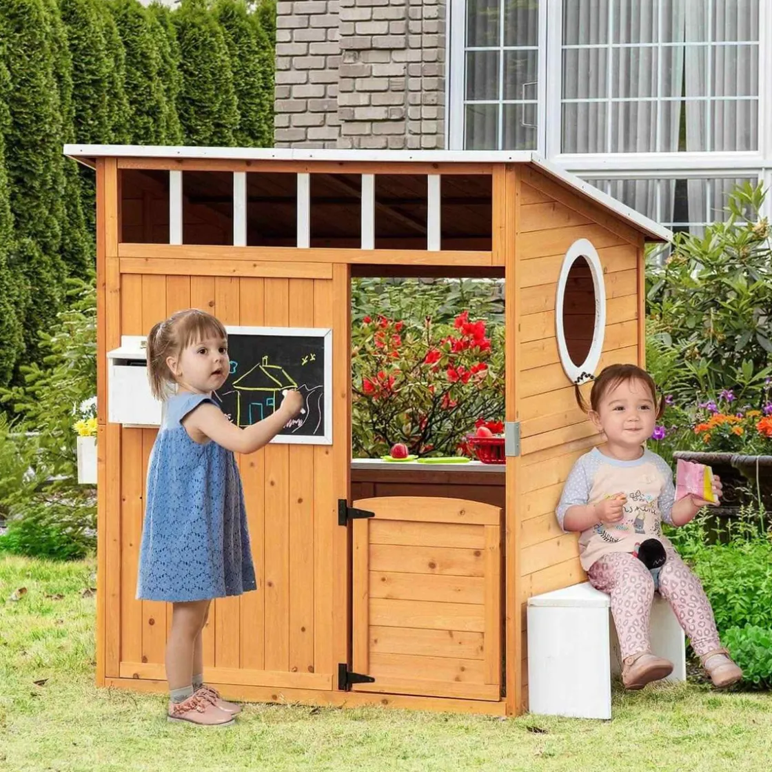 Está hecha de madera de abeto natural y cuenta con todos los detalles para hacer su experiencia de juego lo más realista posible. Incluye un buzón, una jardinera, una pizarra y un banco. Además, cuenta con 3 ventanas y una apertura de entrada amplia con media puerta batiente para que les sea más cómoda de manejar a los más pequeños.
