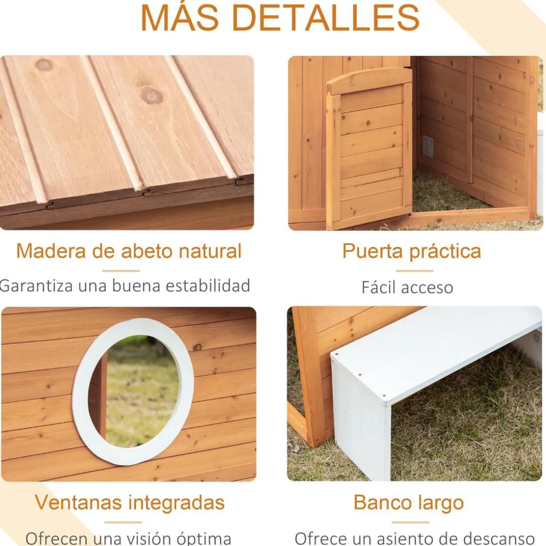- Material: madera de abeto. Medidas totales 122 x 108 x 135,5 cm (con techo) y 122 x 108 x 111 cm (sin techo).