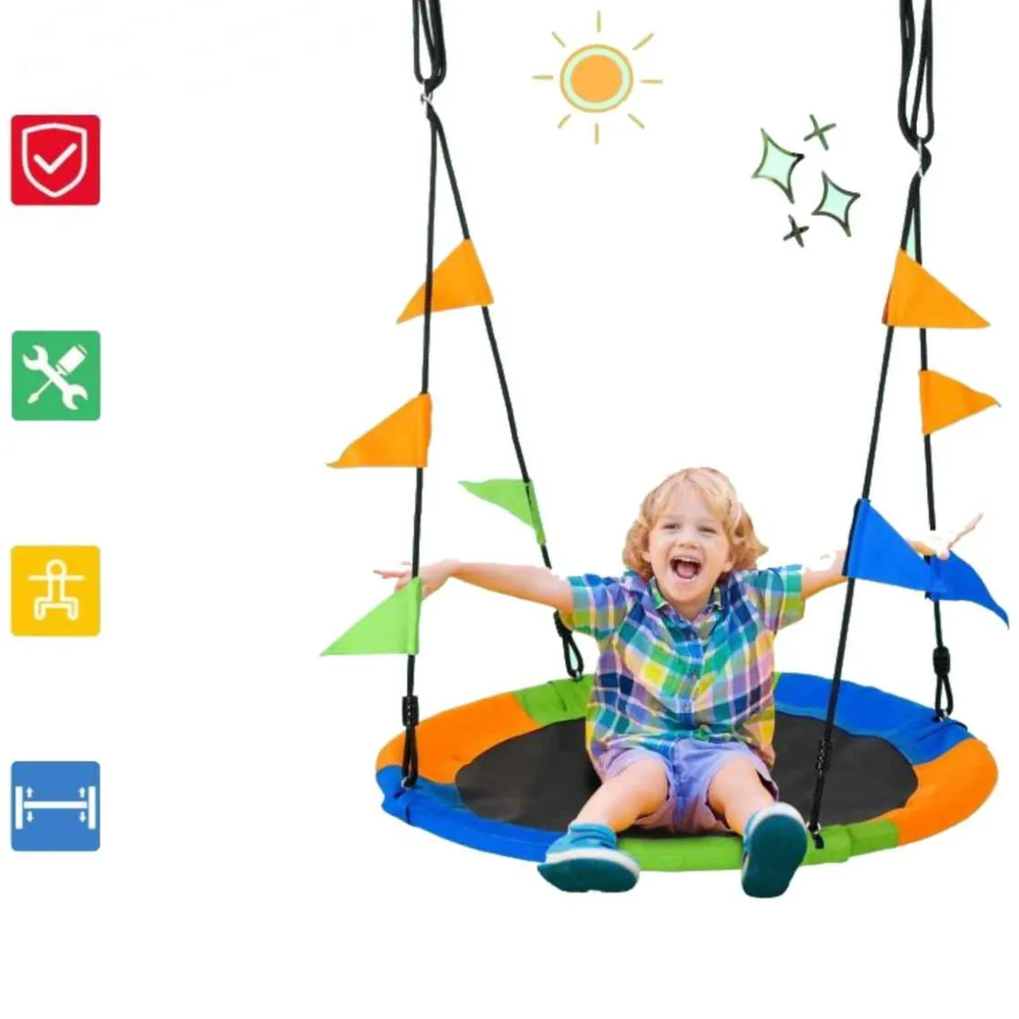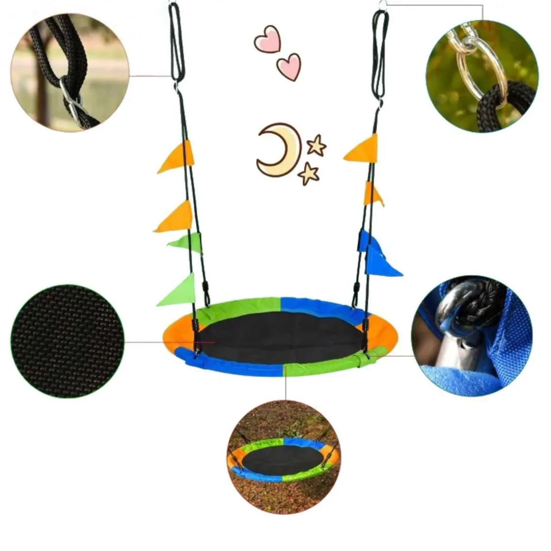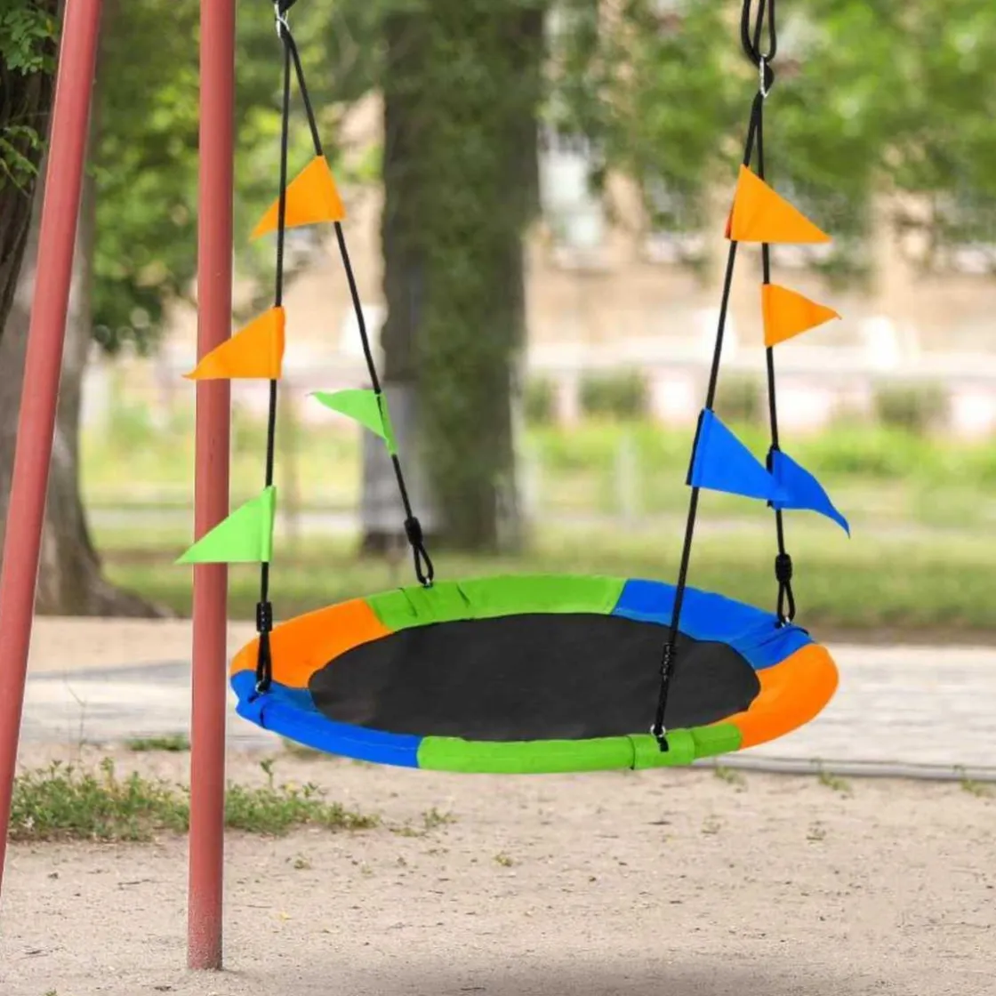 - Columpio nido de gran colorido, con banderolas decorativas.