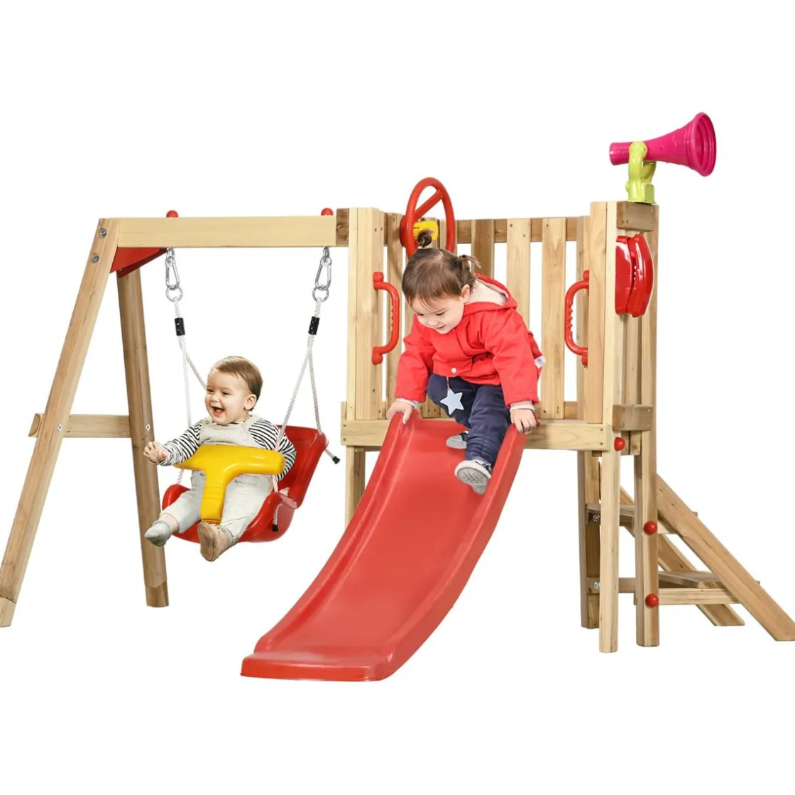 - Este conjunto infantil incluye un columpio, un tobogán, una escalera y extras para más diversión (un volante, un teléfono y una bocina).