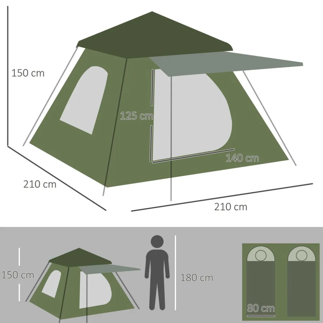 Outsunny – Tienda de campaña Pop Up 210x210x150cm Verde, una tienda para 2-3 personas que se puede montar en cuestión de minutos. Además del espacio interior, esta tienda de campaña impermeable permite convertir la puerta de tela junto a dos postes en un práctico avance en la parte delantera.