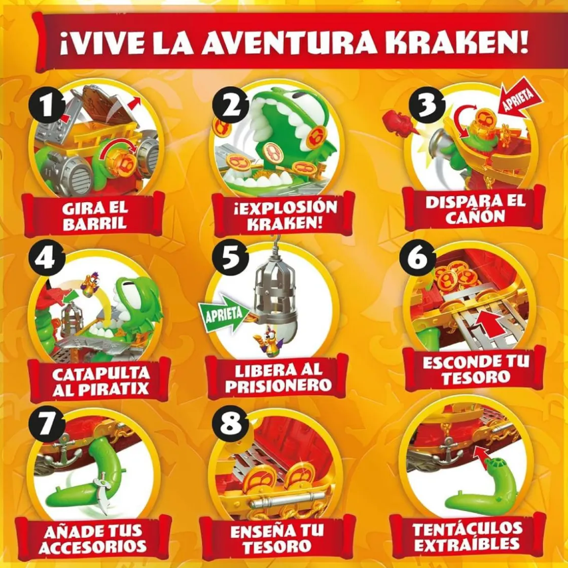 Utiliza el tesoro para apuntar y disparar el cañón, abrir la prisión para liberar los Piratix atrapados y “despertar” al Kraken, que aparecerá en la parte posterior lanzando por los aires todo el tesoro que haya dentro de su boca.