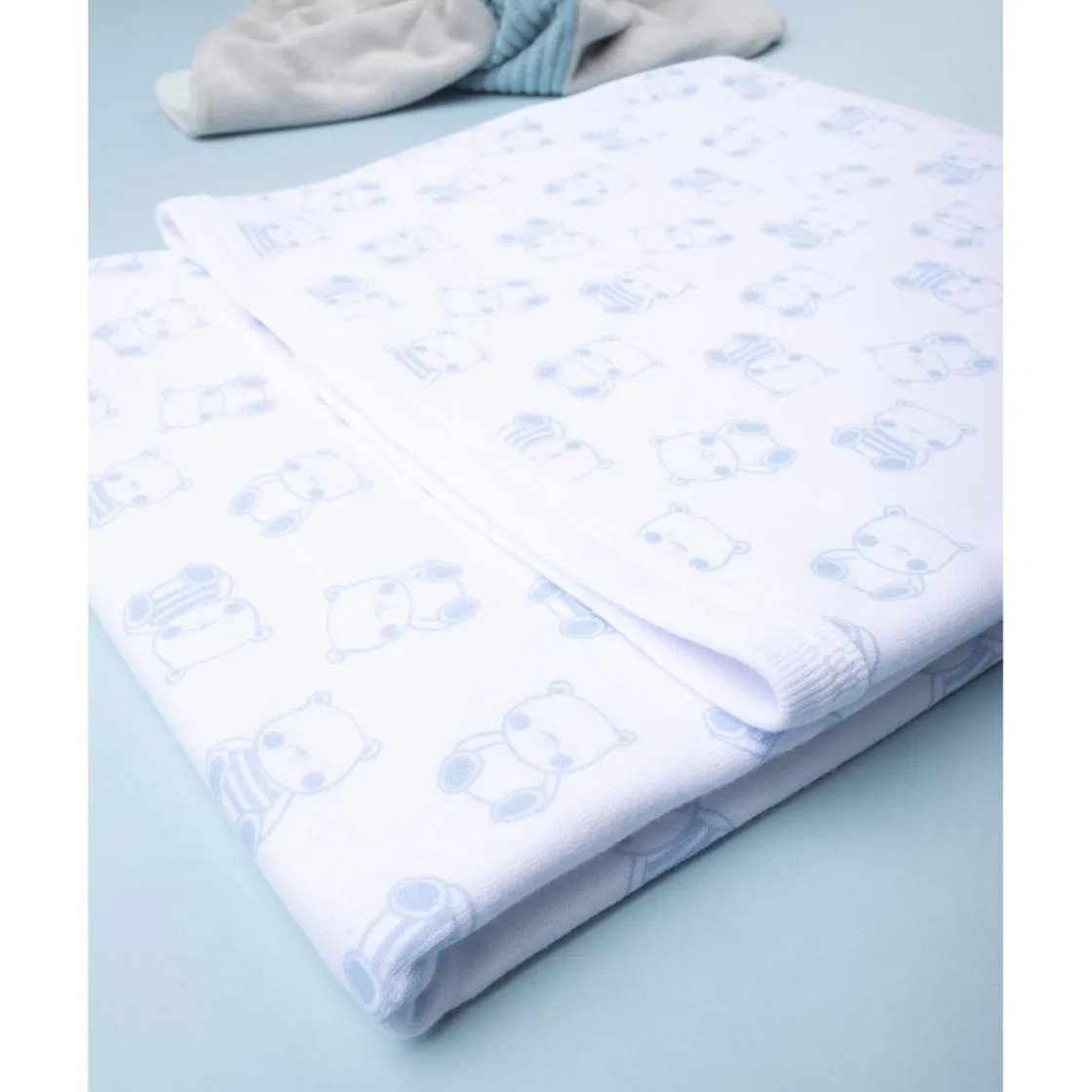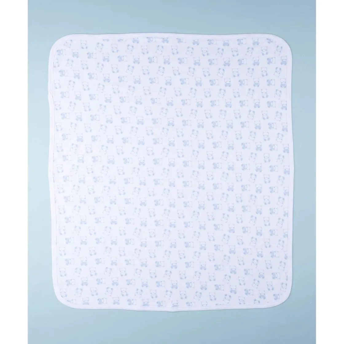 El diseño presenta un adorable estampado de ositos en tono azul claro sobre un fondo crema, aportando un toque tierno.
