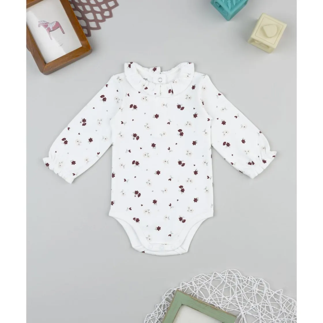 El body de manga larga para niña en blanco crema suma elegancia y funcionalidad. Luce un estampado floral continuo muy suave y un clásico cuello Peter Pan que viste por sí mismo bajo chaquetas o peleles. Los corchetes en la entrepierna y en la espalda agilizan el cambio de pañal y el vestido, mientras que el punto de algodón certificado Oeko-Tex mima la piel con transpirabilidad y tacto dulce.