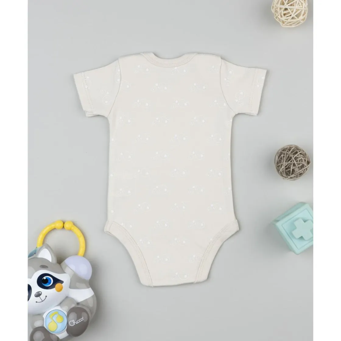 Este body de bebé de manga corta está confeccionado en algodón felpado certificado OEKO-TEX, pensado para la seguridad y el confort de la piel sensible. Se presenta en tono beige con estampado allover de pequeñas flores. Incorpora cuello tipo americano y botones automáticos en la entrepierna para un ajuste fácil.