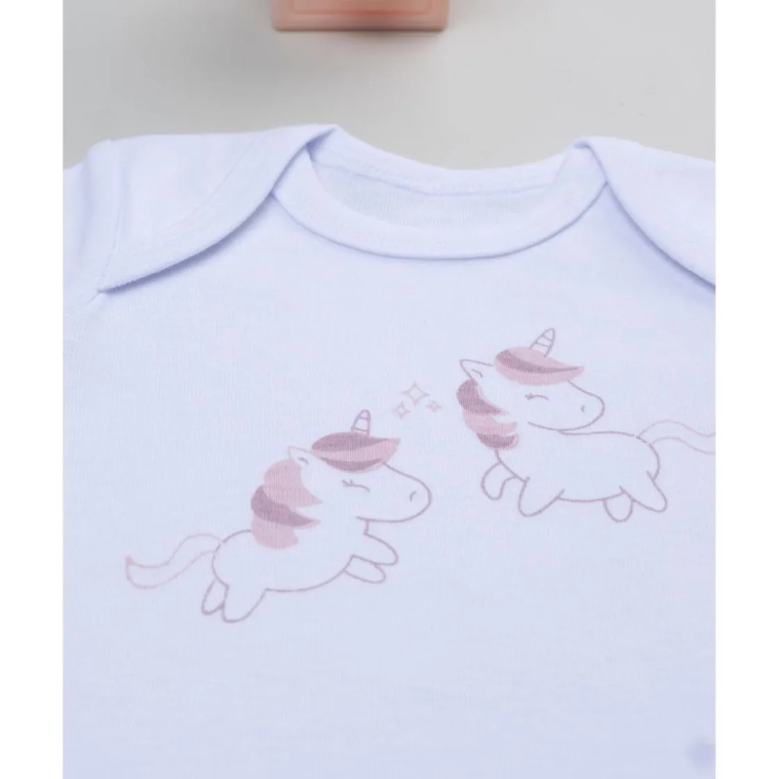Body básico de canalé para niña, en blanco con tierno estampado de unicornios. Ajuste cómodo con botones automáticos en la entrepierna. Hecho en algodón oeko-tex, ideal para la piel delicada.