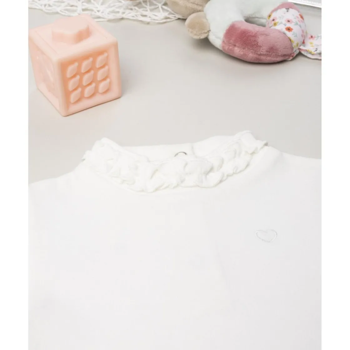 Encantador body de niña en color blanco con cuello alto adornado con un pequeño volante. Su tejido suave y transpirable lo hace ideal para el uso diario, manteniendo al bebé cómodo en todo momento.
