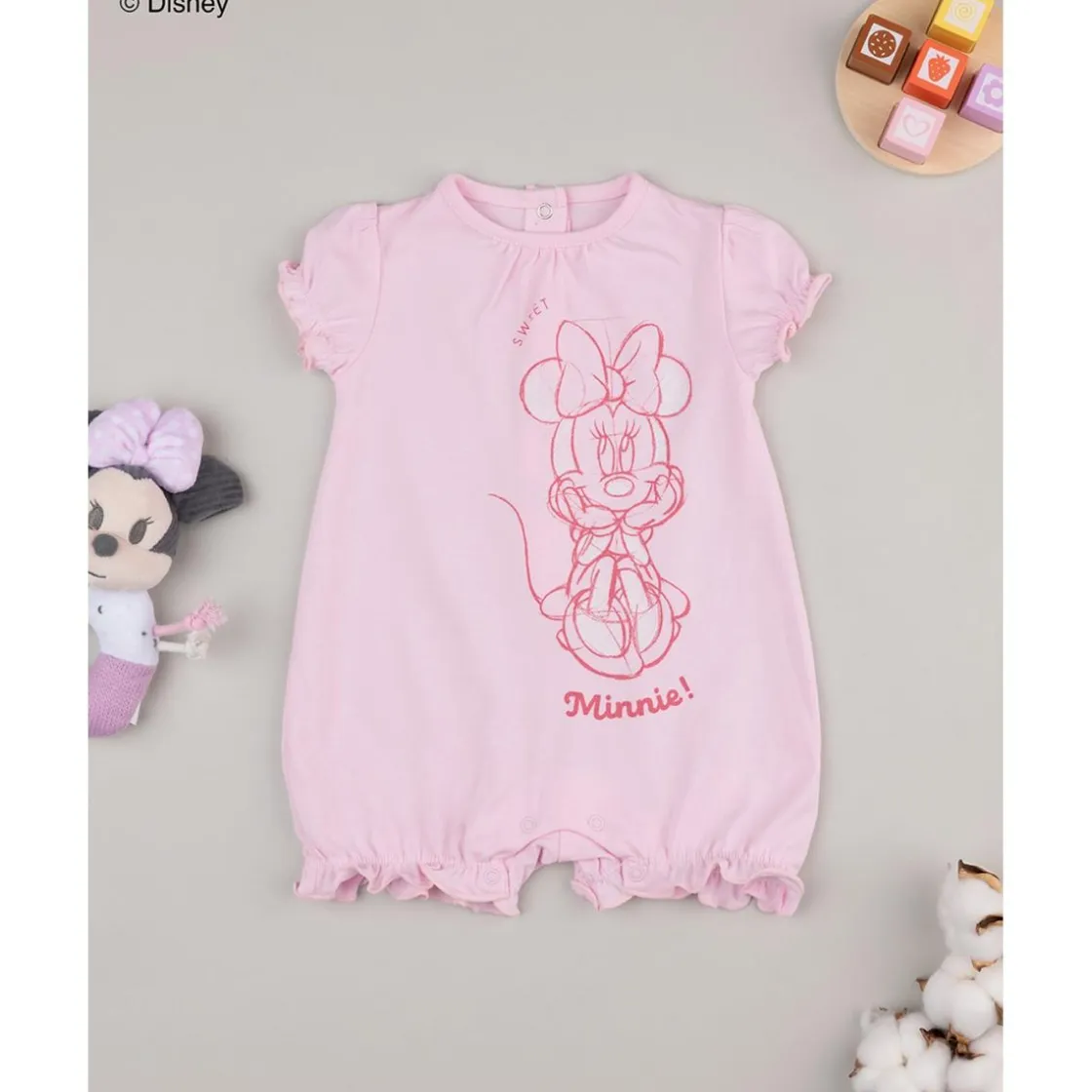 Mono integral con estampado tonal de Minnie de Disney. Broches presión en entrepierna y espalda para cambios de pañal rápidos. Tejido jersey de gramaje medio con certificación GOTS para pieles sensibles.