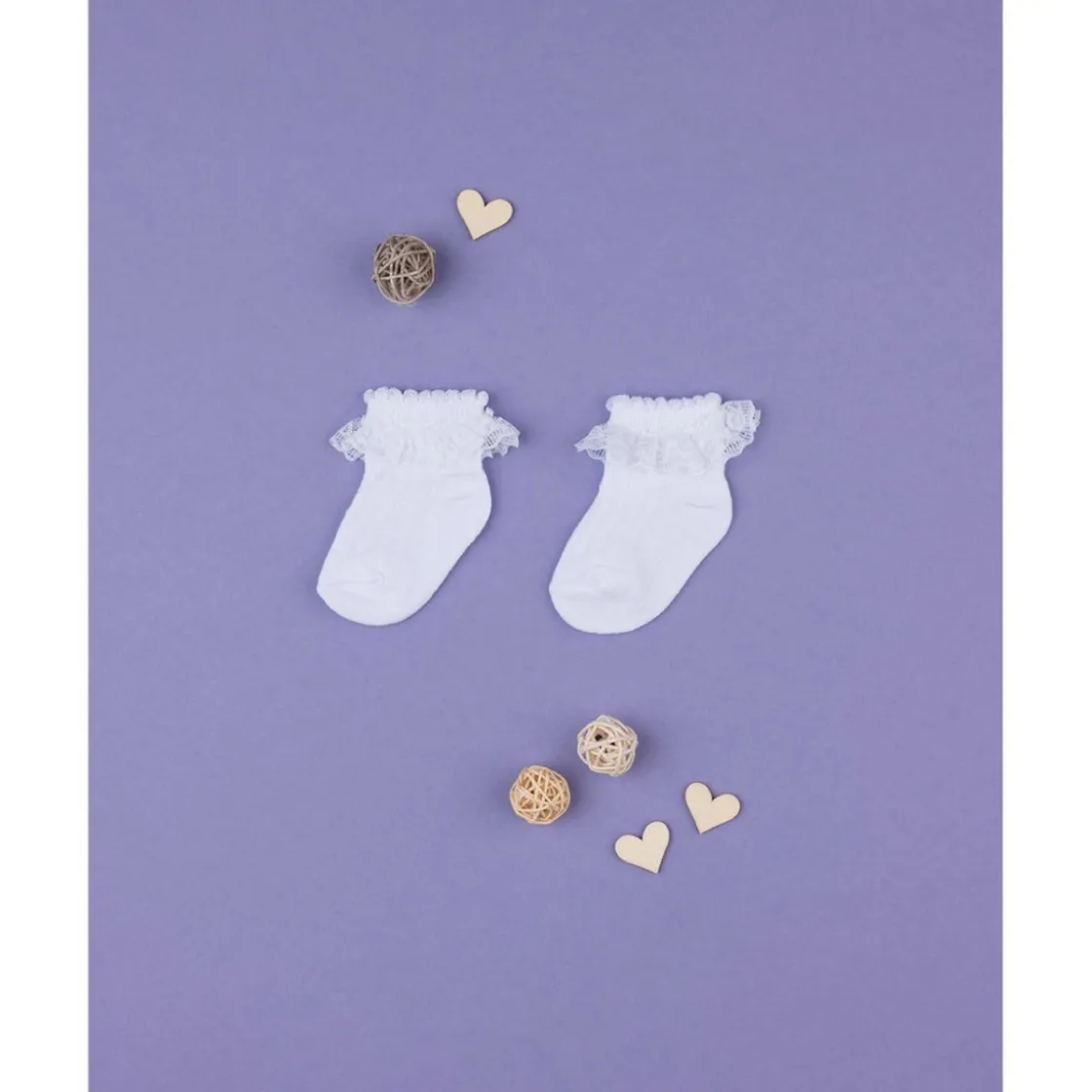 Calcetines para bebé de algodón decorado. Los calcetines se presentan en color blanco liso y están adornados con un refinado encaje blanco en el tobillo. Cómodos y prácticos, estos calcetines son perfectos para conjuntos elegantes y femeninos de bebé. Accesorios no a la venta. El paquete contiene solo la prenda de vestir.