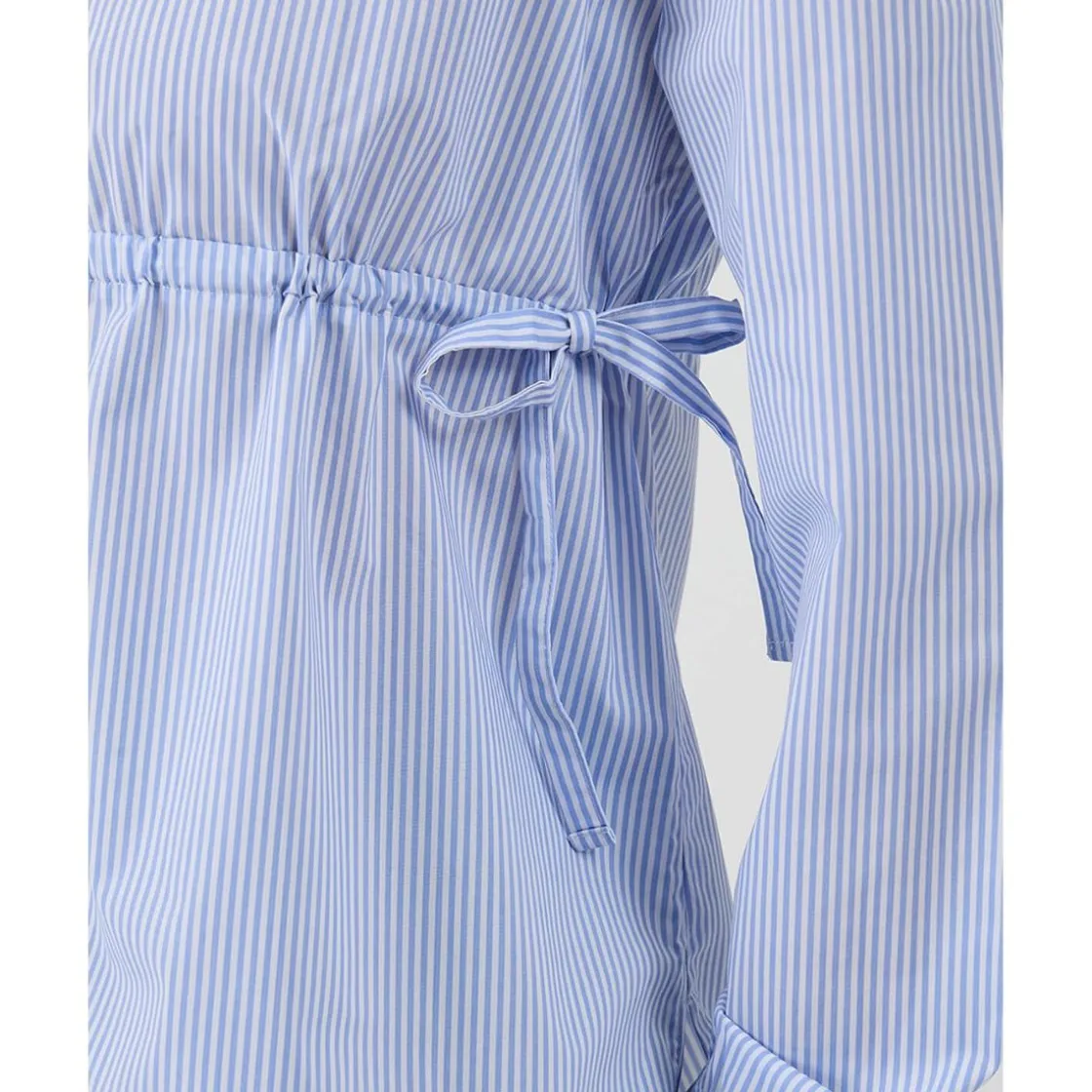 Camisa premamá en popelina de algodón con diseño de rayas blancas y azules. La camisa presenta un cordón debajo del busto, que permite ajustar el ajuste durante todo el embarazo. El cierre delantero con botones hace que la prenda sea cómoda también para la lactancia.