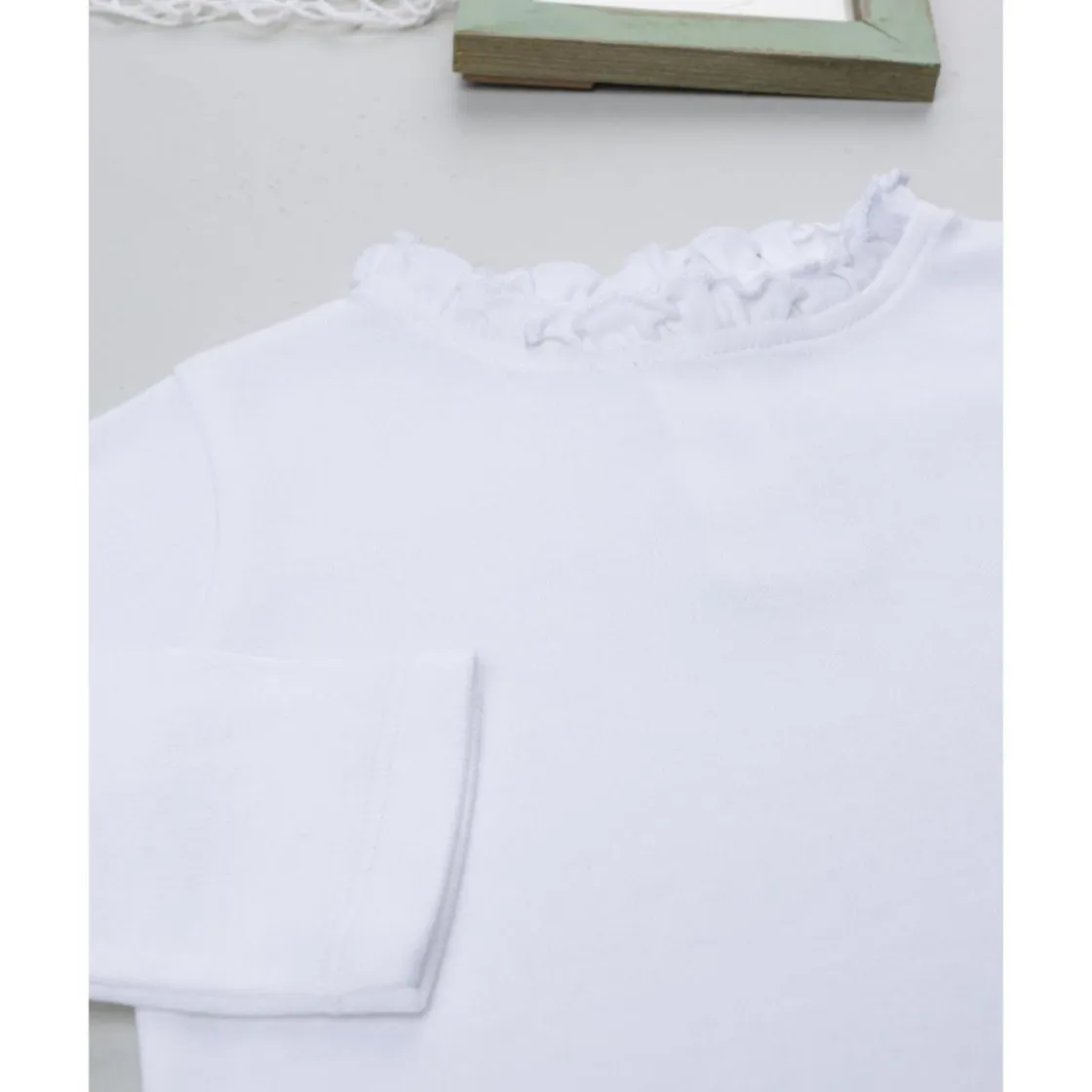 La camiseta de manga larga en blanco es una prenda básica con un detalle especial: su cuello trabajado, que aporta un toque delicado y elegante. Perfecta para combinar tanto con looks casuales como con conjuntos más cuidados.