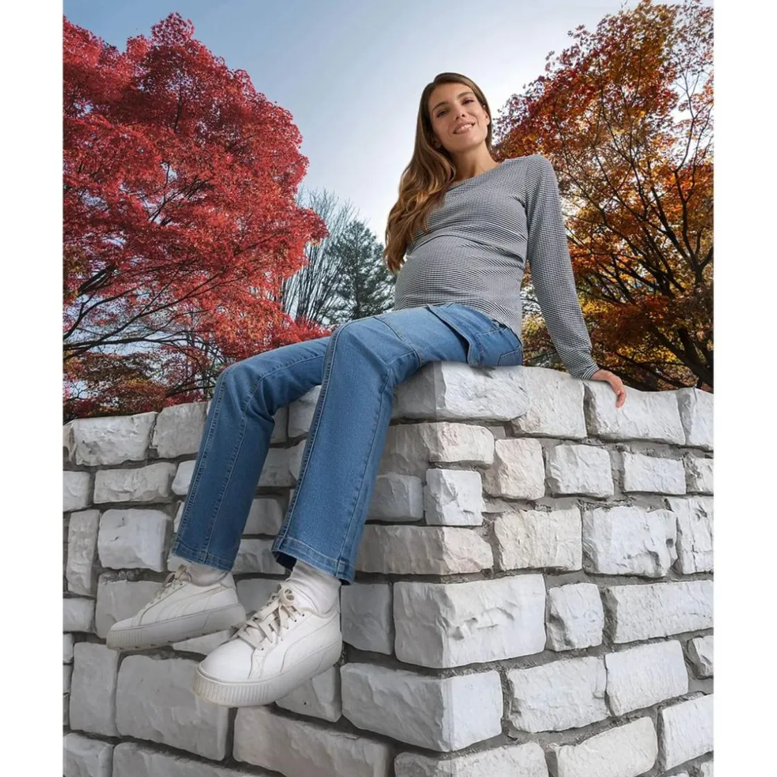 Con cuello redondo y manga larga, se convierte en una opción versátil y elegante para el día a día. Ideal para combinar con vaqueros o leggins, esta camiseta es un imprescindible en el armario maternal, donde el confort y la funcionalidad son esenciales.