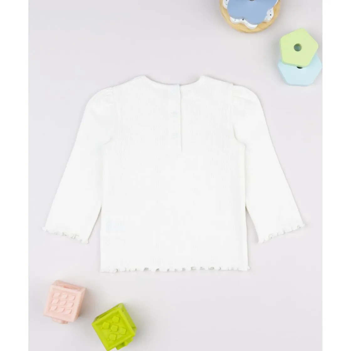 Camiseta básica de canalé para niña, en blanco liso. Suave y cómoda, con botones automáticos en la parte trasera para facilitar el uso diario. Ideal para combinar con cualquier look casual.