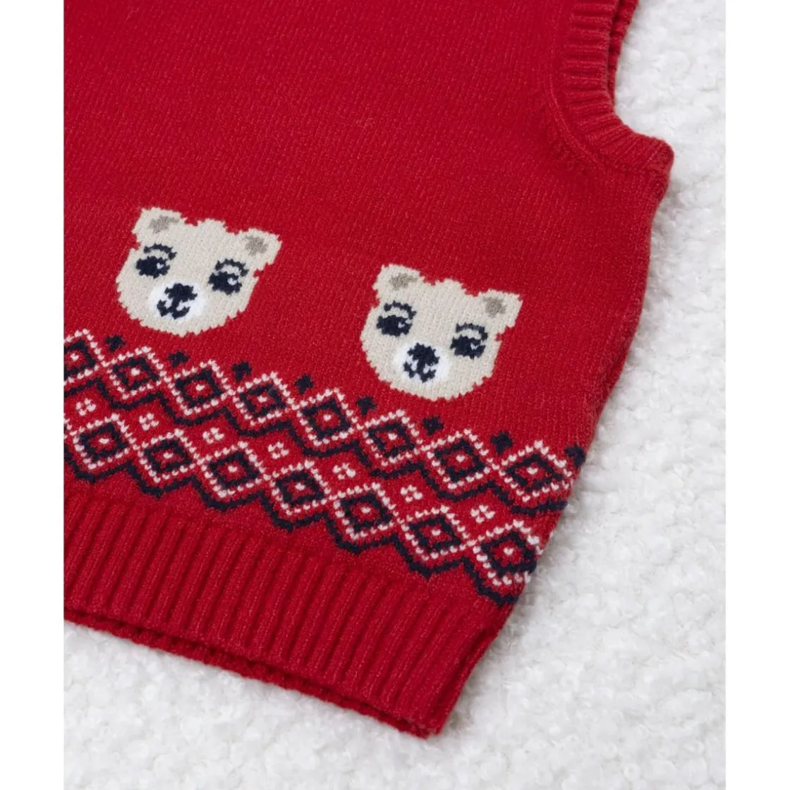Encantador chaleco tricot para bebé en color rojo con pequeños bordados blancos. Su textura cálida y su diseño clásico lo hacen perfecto para combinar sobre camisas o camisetas en los días frescos.