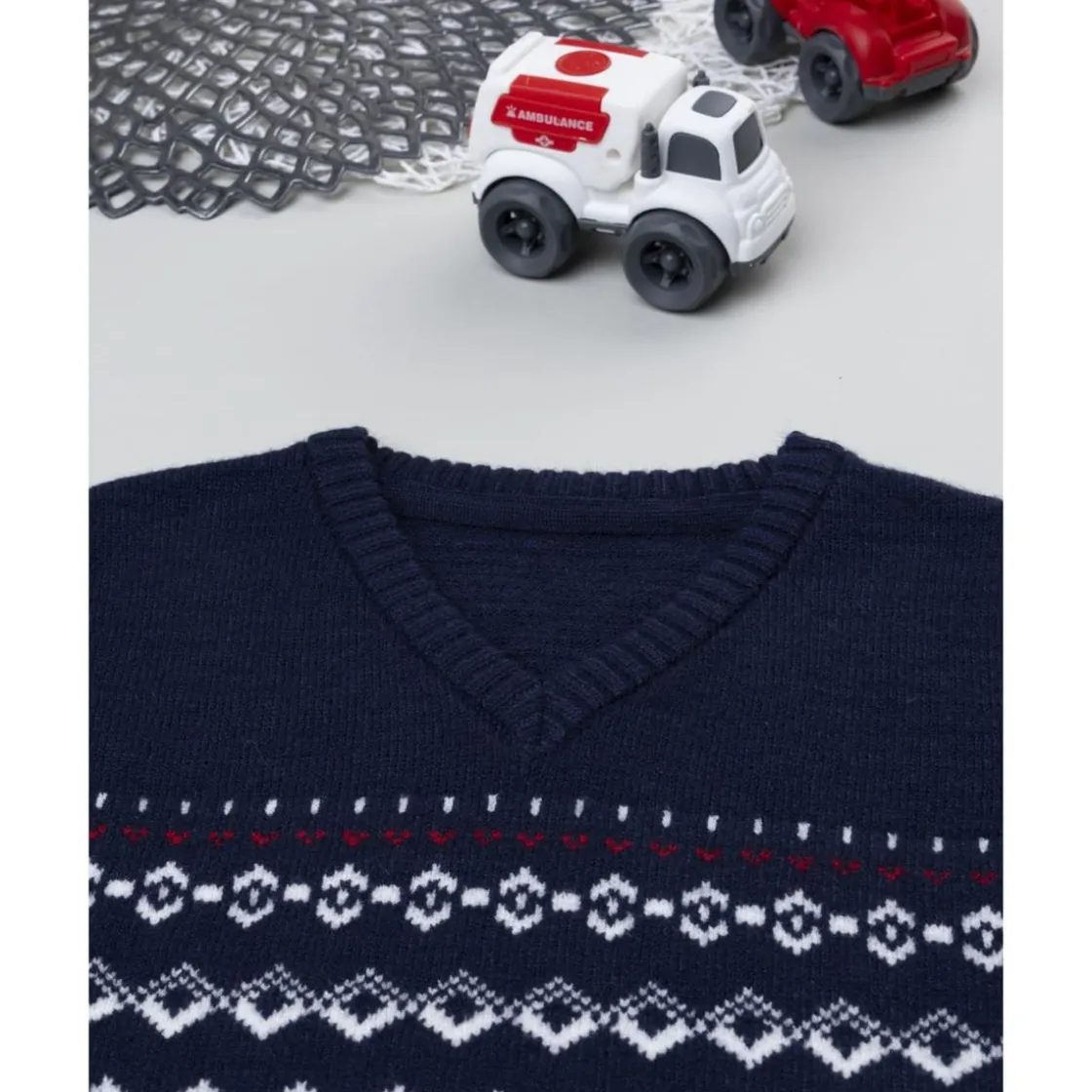 El chaleco de punto azul para niño es una prenda versátil y elegante para los días más frescos. Con un diseño tricotado en color azul marino y bordados decorativos en la trama, combina suavidad, estilo y comodidad. Su corte recto y el tejido flexible proporcionan una sensación agradable y un ajuste natural, perfecto para llevar sobre camisas o camisetas.